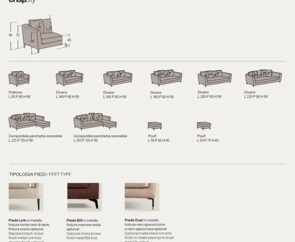 Per ricreare peculiari atmosfere contemporanee nel tuo living, opta per imbottiti dalle tonalità più intense, mentre per quelle più tradizionali, opta per soluzioni in nuance più calde o intermedie; il brand ha creato un rivestimento in tessuto per questo modello Crisp, in modo da renderlo perfetto per ultimare l’estetica del living.