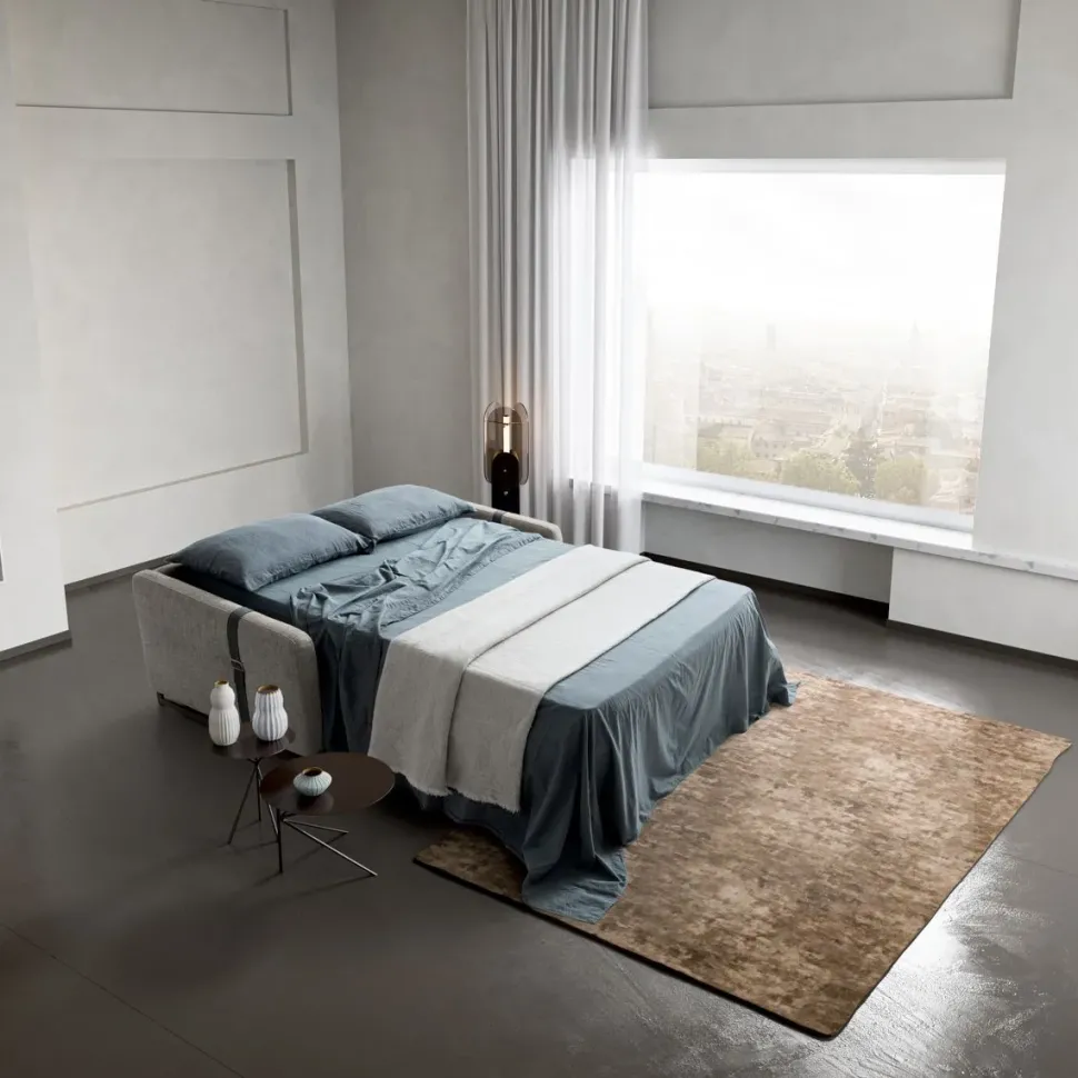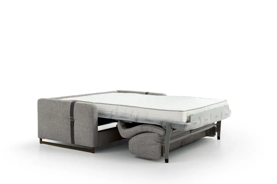 Divano letto dal design semplice e minimale ,invitante e confortevole, Maya si fa apprezzare per il design lineare corredato da piccoli cinturini in pelle che avvolgono gli esili braccioli, elementi caratterizzanti del modello. Dotato di meccanismo a ruote che permette gli spostamenti semplici e veloci. Un insieme di grande effetto e di estrema comodità. Il divano misura L 206 cm P 98 (aperto P 209 cm). Monta una rete da 160 x 195 ed è già dotato di rivestimento copri rete e materasso in poliuretano espanso h 16 cm con top in memory foam. Il rivestimento in tessuto è completamente sfoderabile.