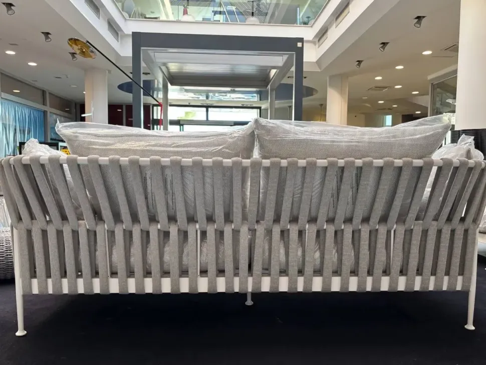 Struttura in acciaio col. bianco: schienale con cuscinatura e corde imbottite intrecciate col. grigio.