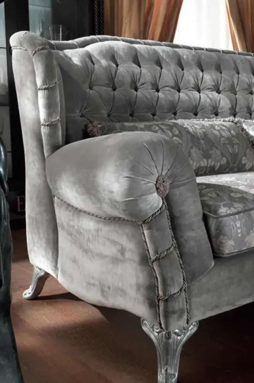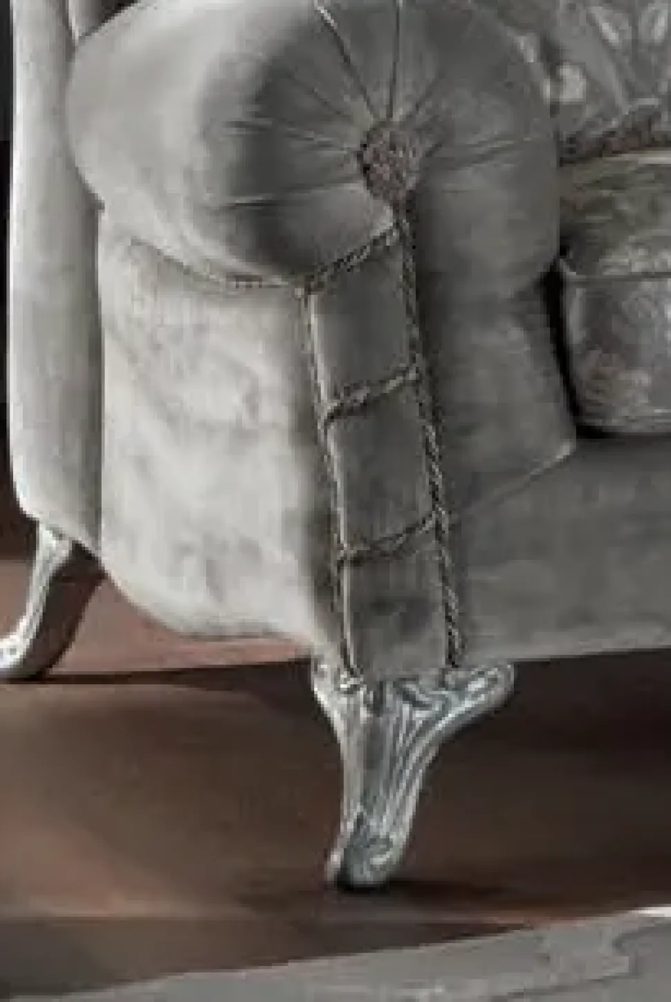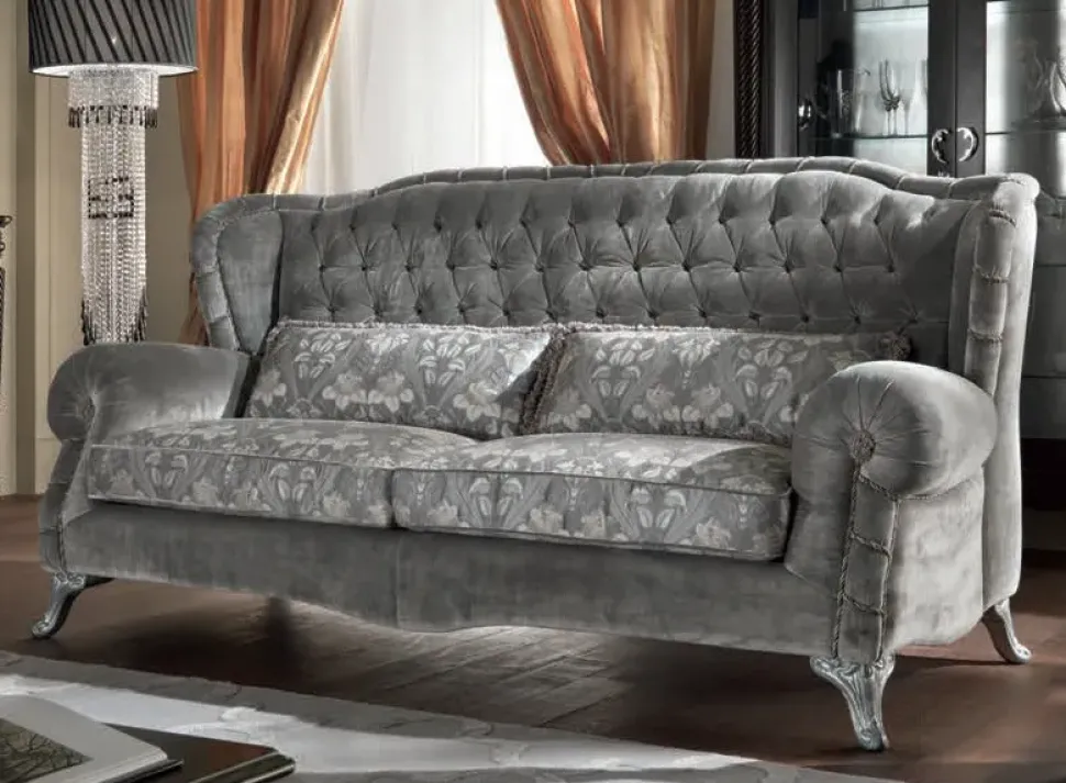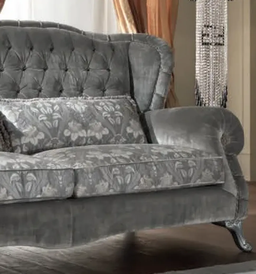 I piedini sono a vista di color argento ed impreziositi con intagli che rendono ancor di più elegante e lussuoso questo divano.