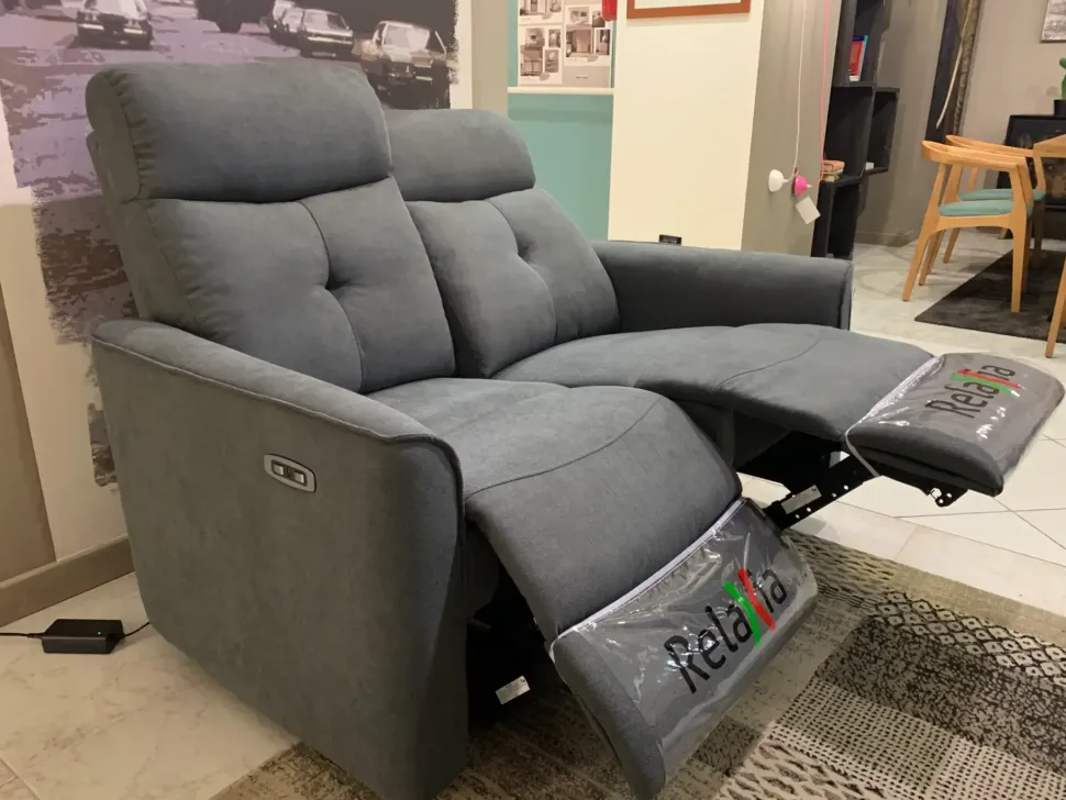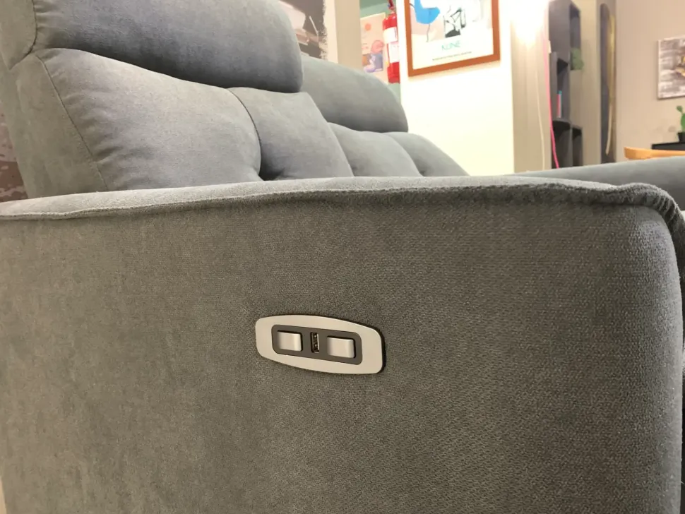 DIVANO 2 POSTI con relax elettrici e indipendenti – tessuto in ciniglia – imbottitura del cuscino della seduta con box system a molle insacchettae comandi laterali con presa USB