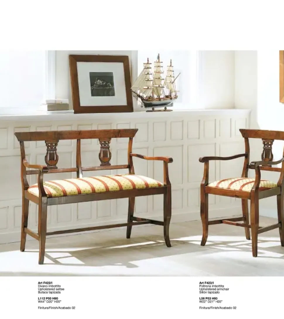 Divano in noce nazionale, con seduta imbottita stoffa o pelle a richiesta