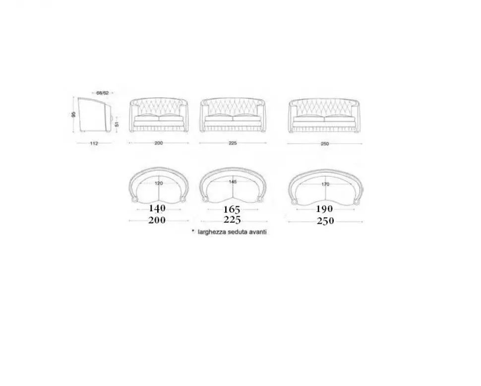 - I mobili sono da scegliere attentamente non solo per quanto riguarda le finiture con cui sono stati costruiti, ma pure per quanto riguarda le misure e lo spazio che occupano nei locali domestici: il modello qui visibile fa parte della fascia di imbottiti che vanno da 201 a 225 cm.