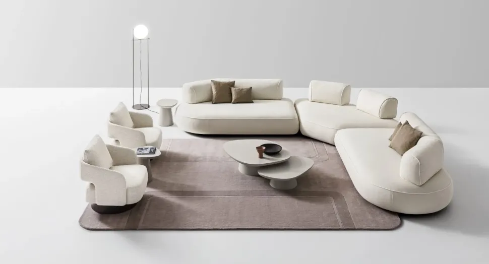 - La componibilità permette di combinare moduli di diversa forma e grandezza, come sedute singole, chaise longue e pouf coordinati.