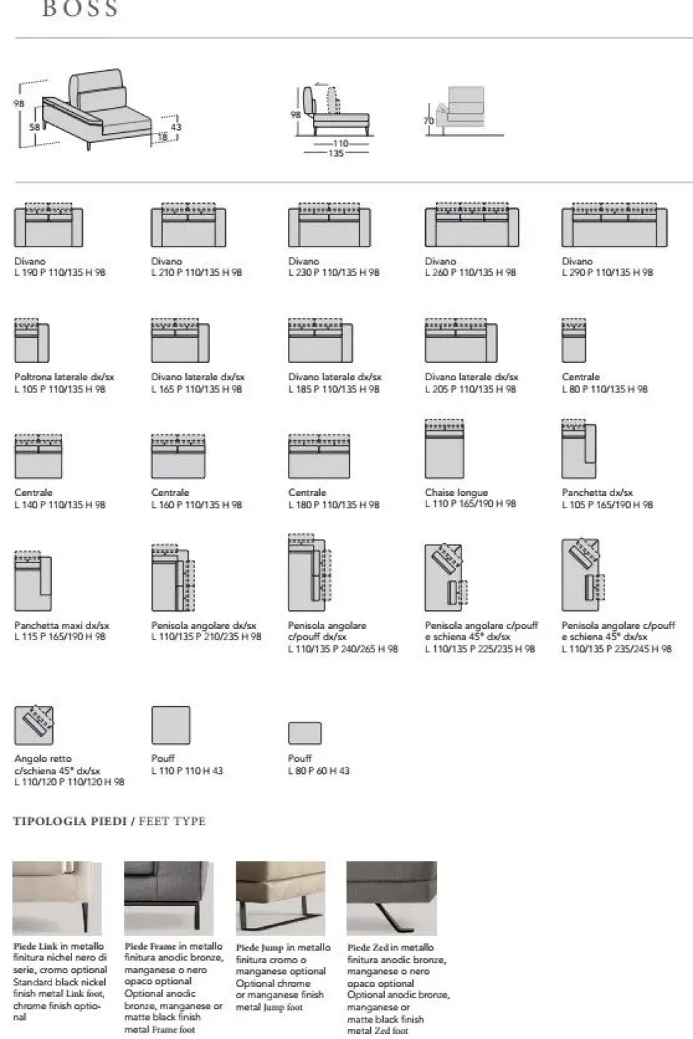 Divano mod. Boss , proposto con penisola da cm. 270×165 . Prezzo con tessuto in cat. A , tutti gli schienali sono dotati di un comodo meccanismo che consentono di aumentare la seduta per un confort senza limite . Piedini di serie mod. Link. cuscini arredo optional .