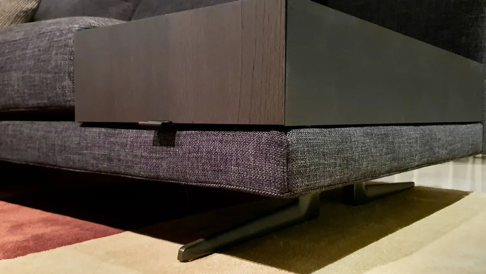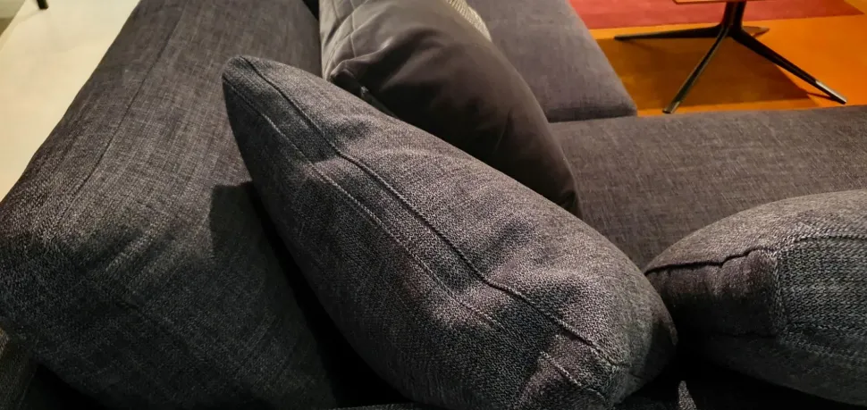 Il divano è rivestito in tessuto Itaca colore Carbone. La composizione del tessuto è: 30% Viscosa, 35% Acrilca, 15% Poliestere, 10% Cotone, 10% Lino.