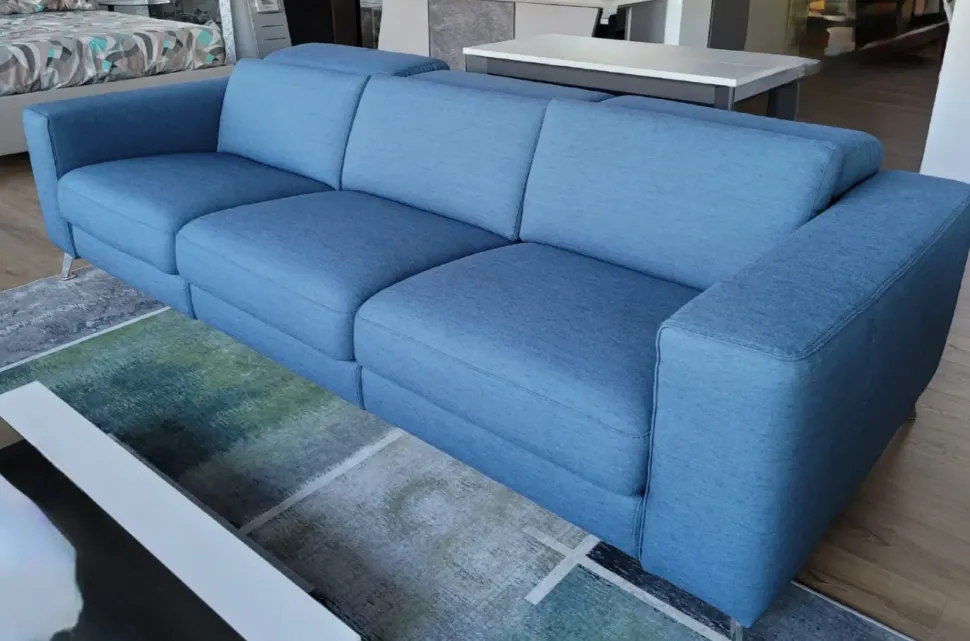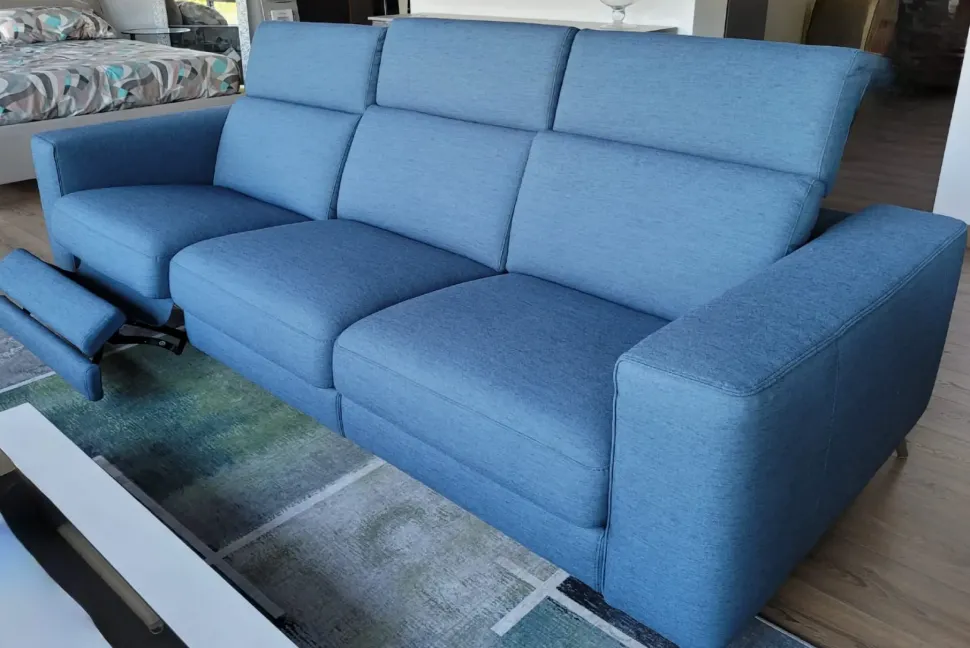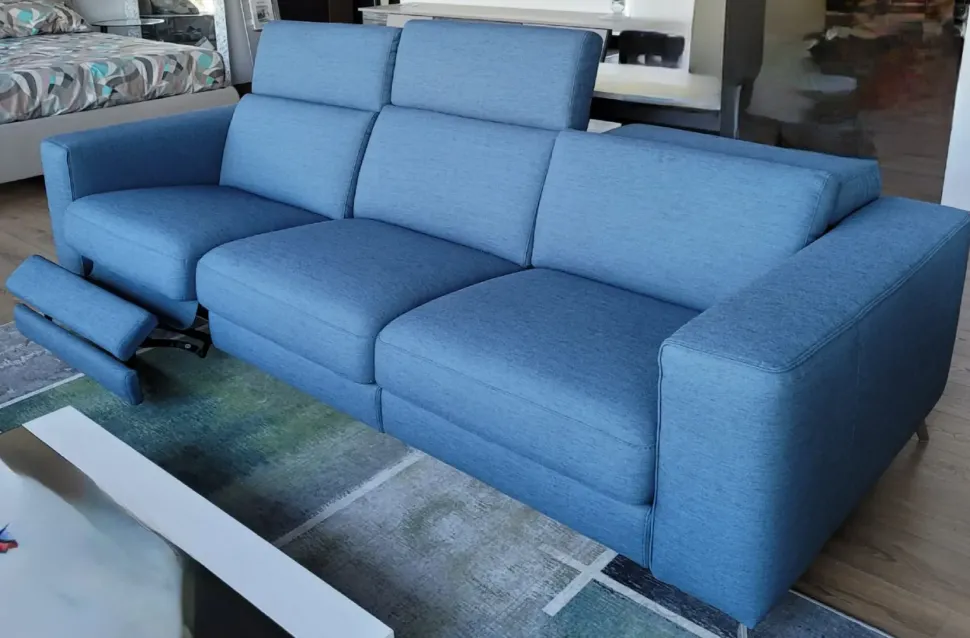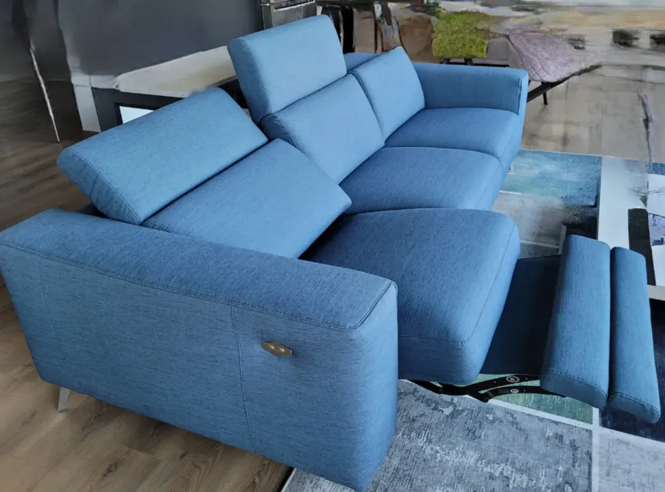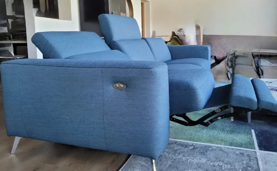 Divano Mooving in tessuto colore ottanio idrorepellente, parzialmente sfoderabile. Misure cm 260 x 108 (meccanismo aperto cm 165), altezza cm 70 (con 3 poggiatesta reclinabili aperti altezza 101 cm). Dotato di un meccanismo relax elettrico sul lato.