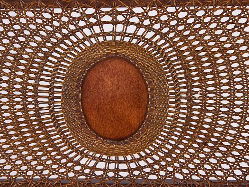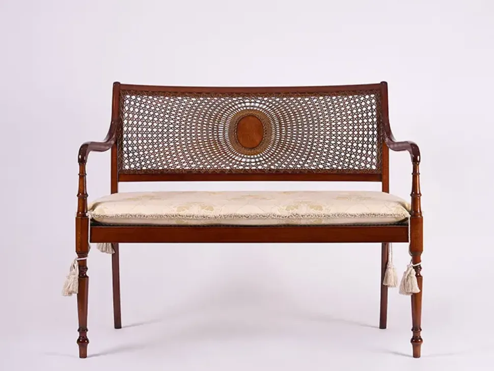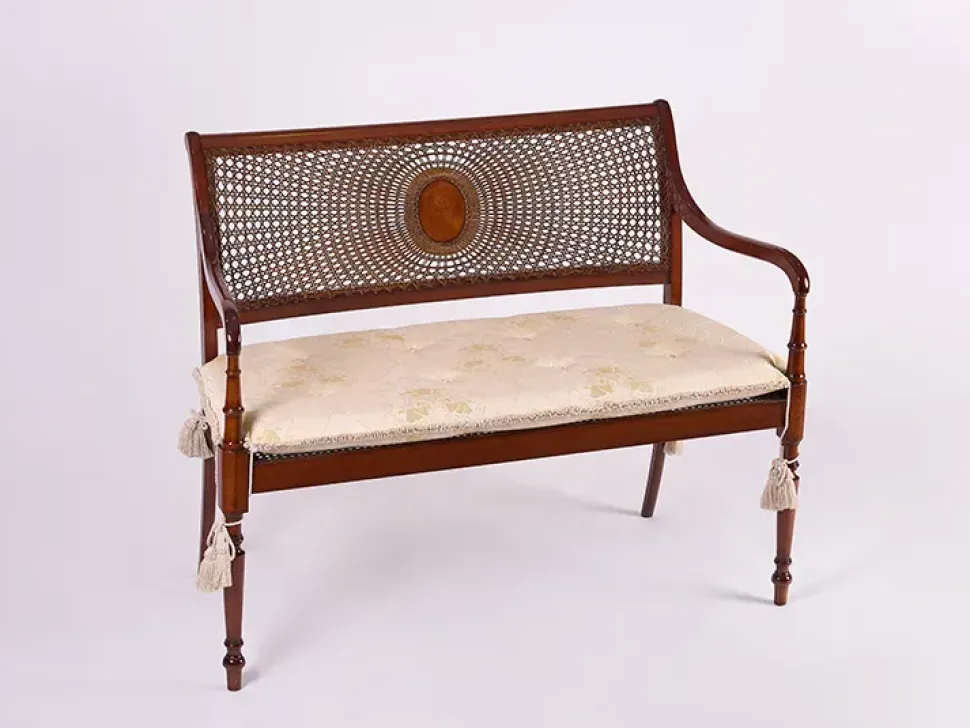 - Divanetto 2 posti con struttura in piuma di noce ducale e schienale in paglia di Vienna intrecciata a mano con motivo raggio di sole – Dimensioni divanetto: L 107 P 56 H 88 Hs 50;