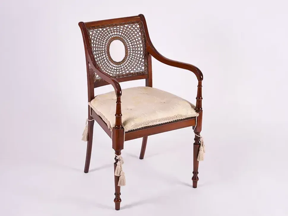 - 02 Poltroncina con struttura in piuma di noce ducale e schienale in paglia di Vienna intrecciata a mano con motivo raggio di sole – Dimensioni poltroncina: L 54 P 56 H 88 Hs 50