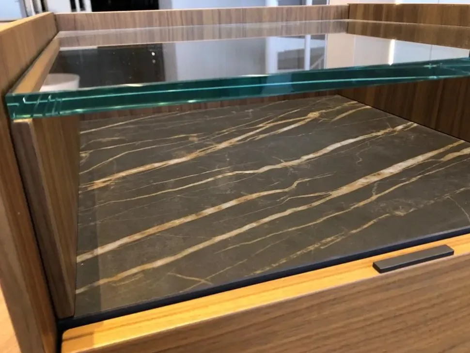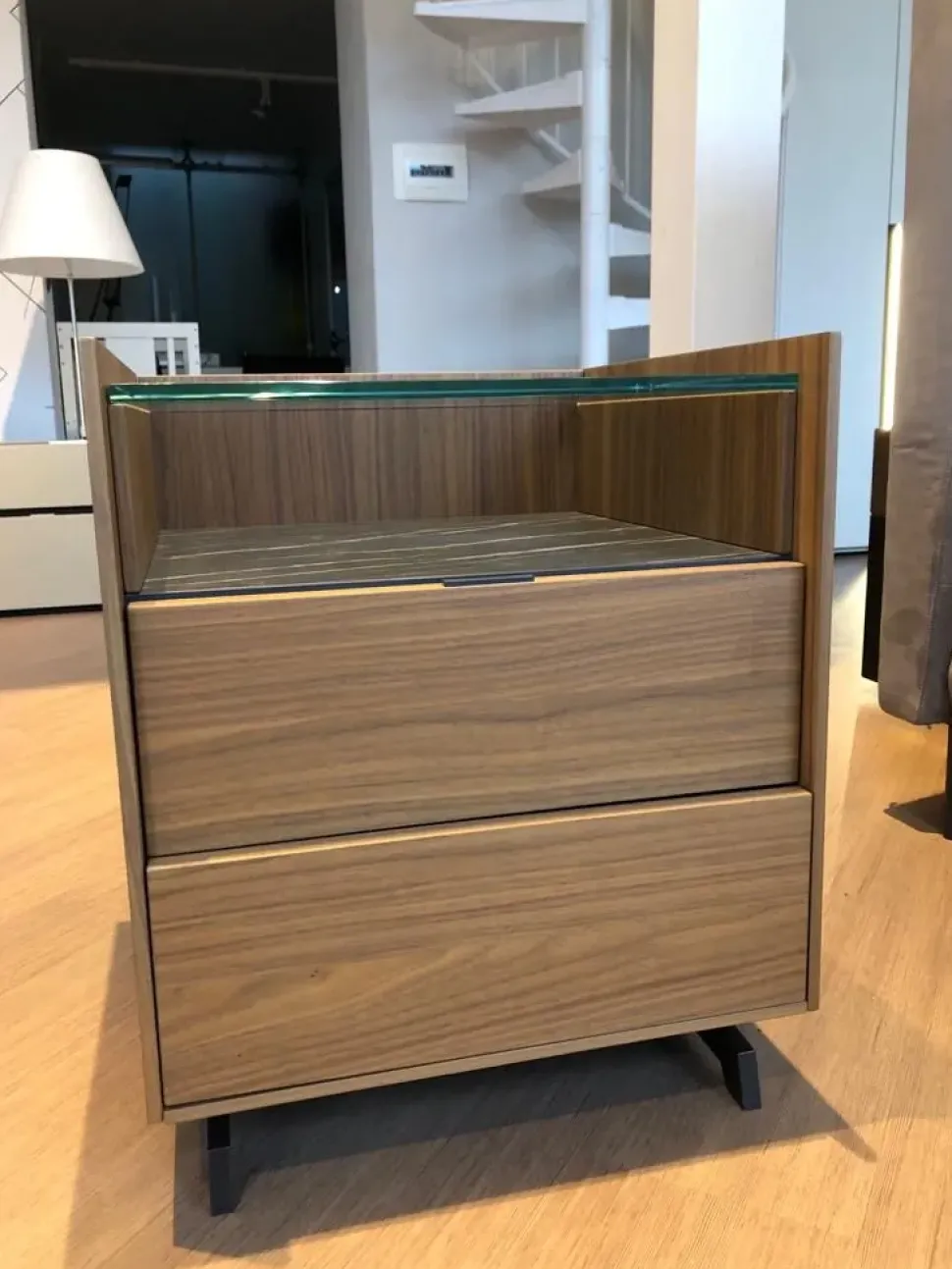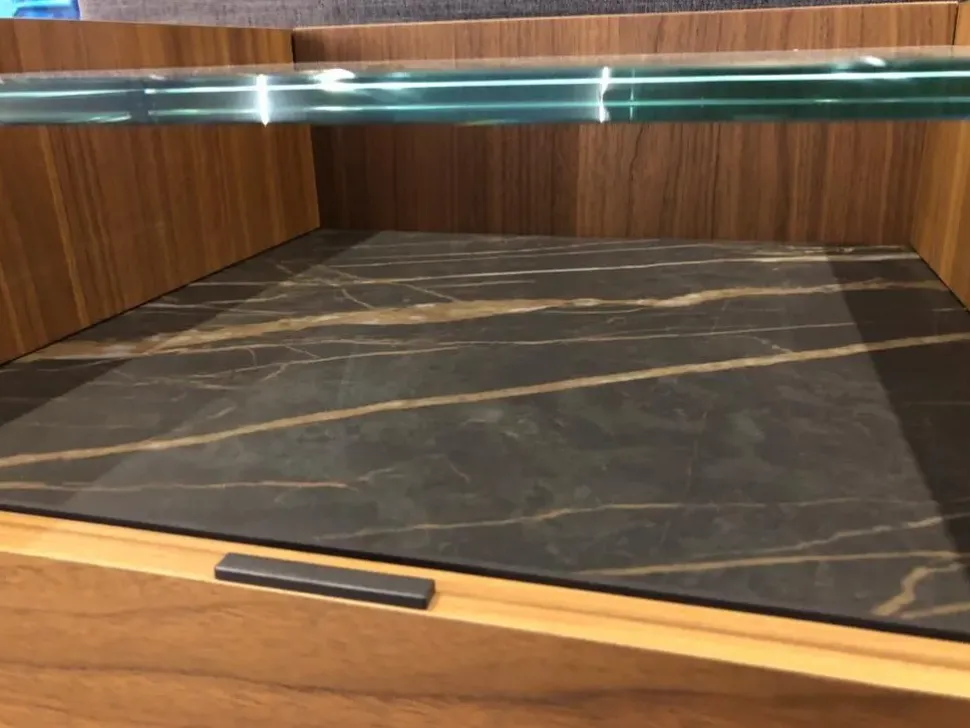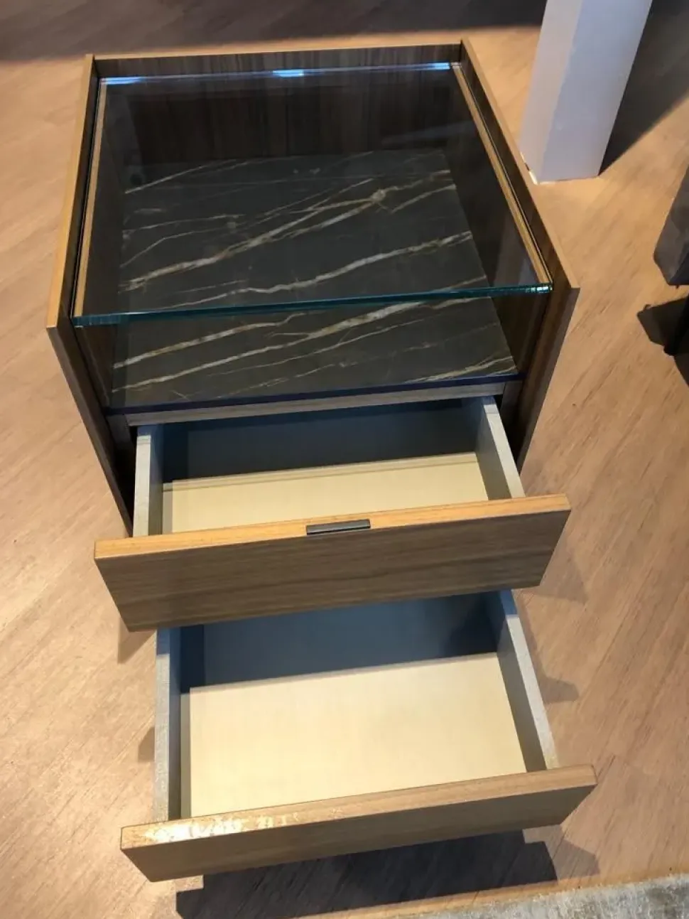 In questo caso, il top è realizzato in ceramica effetto marmo Noir Desir opaco con il piano in vetro che fa da lente per la sua matericità, sottolineando la preziosa leggerezza dell’insieme. La parte inferiore è, invece, dotata di due ampi cassetti ad estrazione totale, con frontale di spessore 2cm: il primo con sistema di chiusura rallentato e maniglia Minimal finitura metallo Brown, il secondo con meccanismo push-pull. Il comodino presenta la parte perimetrale e i cassetti in impiallacciato Noce Canaletto, l’appoggio a terra viene garantito dal basamento sospeso sagomato con piedini in metallo finitura Brown.