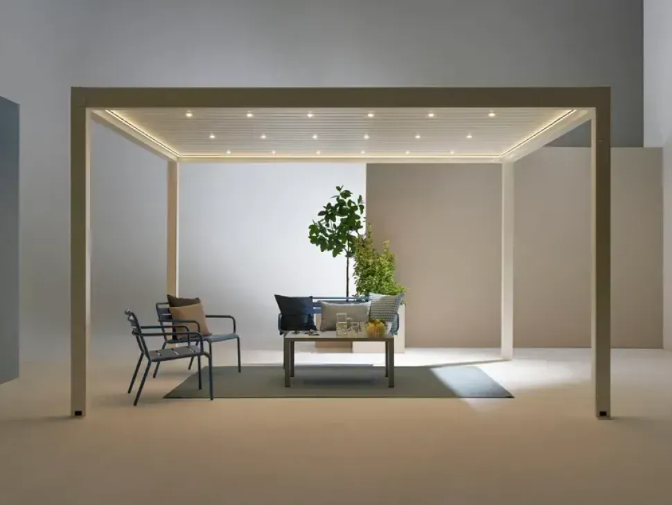 la nuova pergola Gibus coniuga elevate prestazioni tecniche: presenta infatti lame di copertura che ruotano fra 0° e 115° attorno al perno inferiore, mitigando all’occorrenza l’intensità dei raggi solari in modo da garantire ombreggiamento a piacere, o proteggendo da vento e precipitazioni. Oltre alla protezione orizzontale, Movie può essere ulteriormente riparata grazie alla chiusura dei fronti laterali con vetrate scorrevoli e schermature zip (trasparenti, ombreggianti, oscuranti, antinsetto), per assicurarsi in ogni momento le condizioni di comfort desiderate. Per un utilizzo ancora più versatile, può essere inoltre dotata di illuminazione a LED (Spot integrabili nelle lame o Strip perimetrali), ideale per far luce sotto la struttura dal calar del sole.