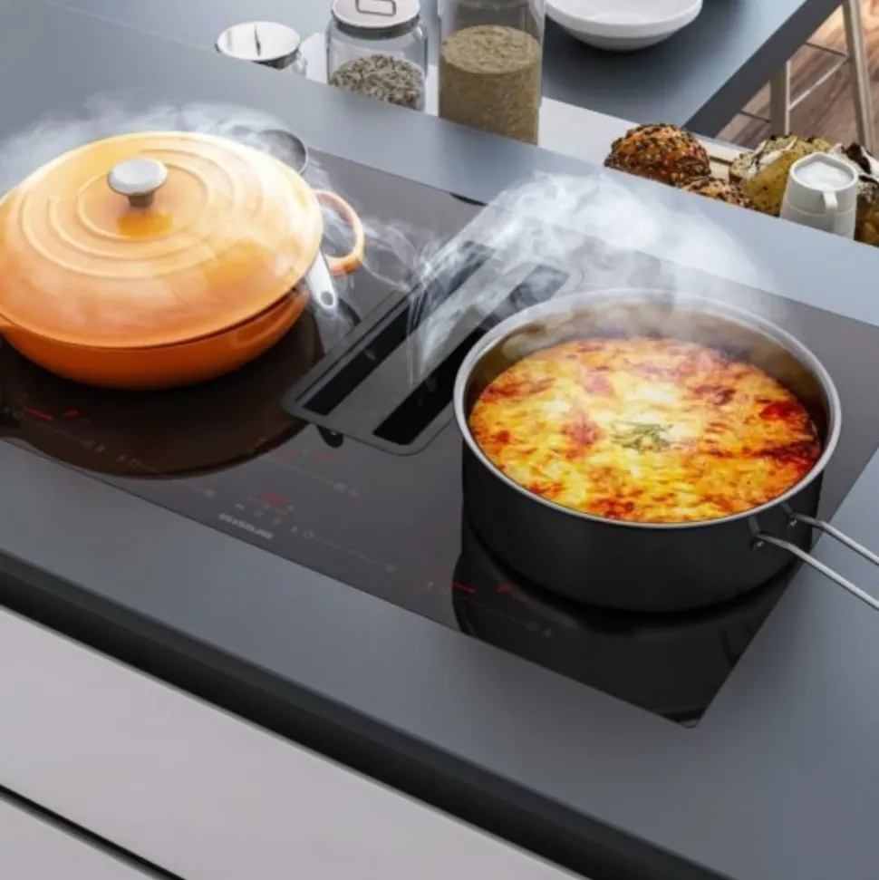 Questo piano cottura offre prestazioni elevatissime grazie alla sua forma aereodinamica, garantendo allo stesso tempo risparmio di spazio in quanto comprende in una sola superficie la cappa e il piano cottura. I prodotti integrati garantiscono un migliore utilizzo dello spazio, grazie alla soluzione 2 in 1. La cappa integrata aspira il vapore e gli odori di cottura direttamente dalla fonte, assicurando così un flusso continuo di aria pulita.