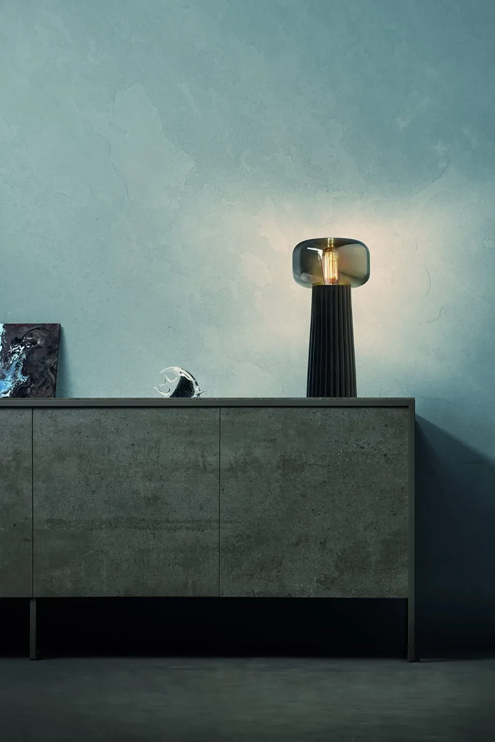 - Che materiali caratterizzano questa lampada da tavolo?La lampada ha una base in ceramica e un diffusore in vetro soffiato fumè. Il cavo è rivestito in tessuto nero con interruttore ON/OFF integrato.