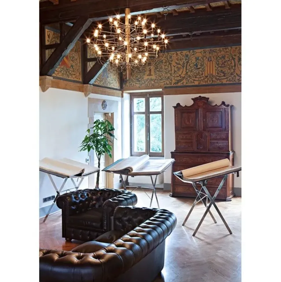 Poiché gli ambienti domestici devono essere organizzati con una peculiare logica, cosicché gli arredi, tra cui anche l’illuminazione, organizzino al meglio lo spazio senza risultare ingombranti, il brand ha ideato una grande varietà di modelli di lampade, da terra e abat-jour, a sospensione o paretali; il modello qui presente è un bellissimo esempio di lampada a sospensione firmata dal brand.