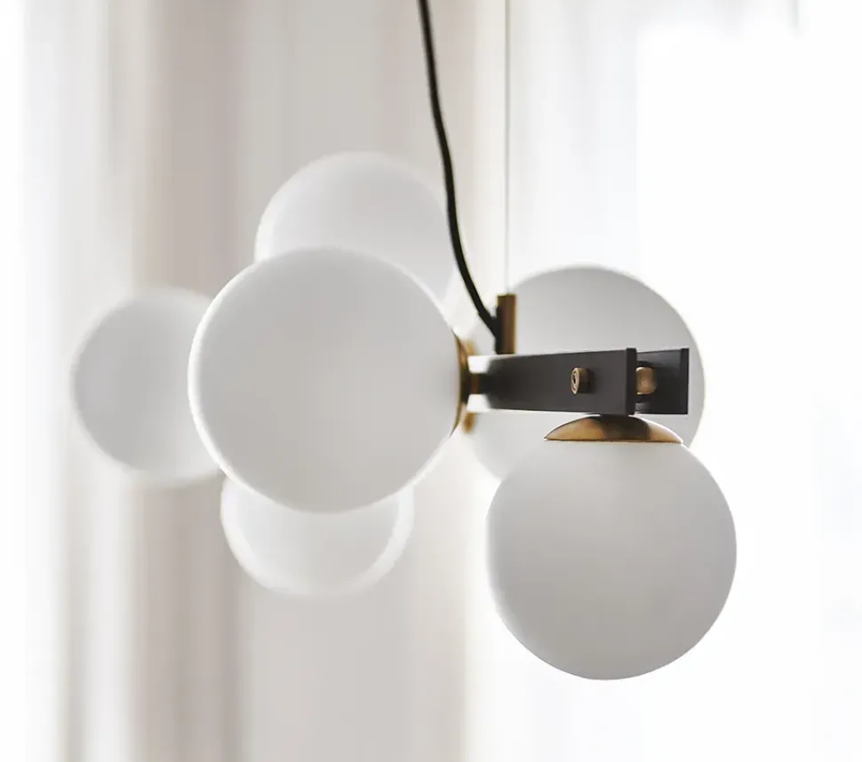 Lampada da tavolo a sospensione con struttura in ferro brunito e dettagli in ottone spazzolato. Paralumi in vetro soffiato bianco satinato. Lampadine incluse.
