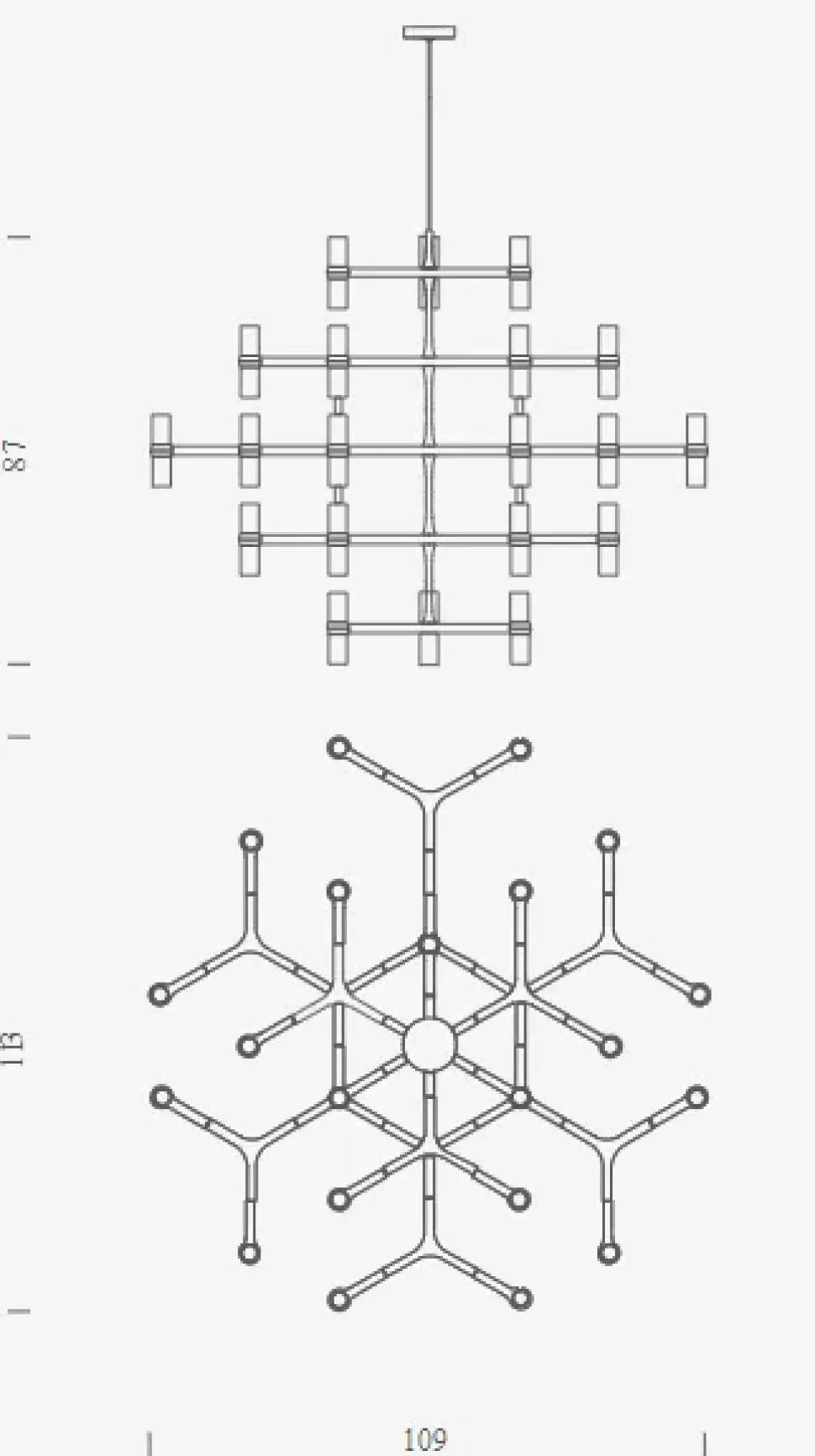 Famiglia di chandelier a sospensione la cui forma si ispira alla sagoma del cristallo di neve.