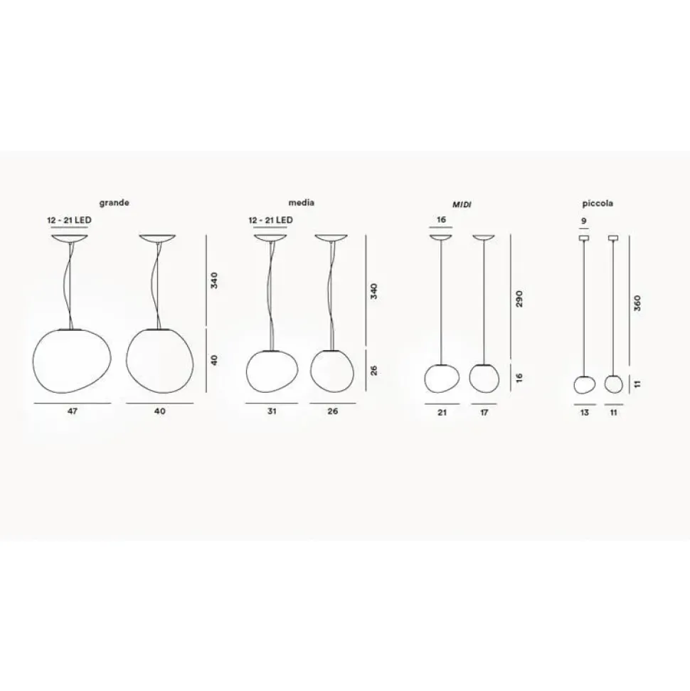 Forme organiche e poetiche realizzate in vetro soffiato a bocca, per una famiglia di lampade che comprende varie misure, utilizzabili singolarmente o in composizioni multiple.