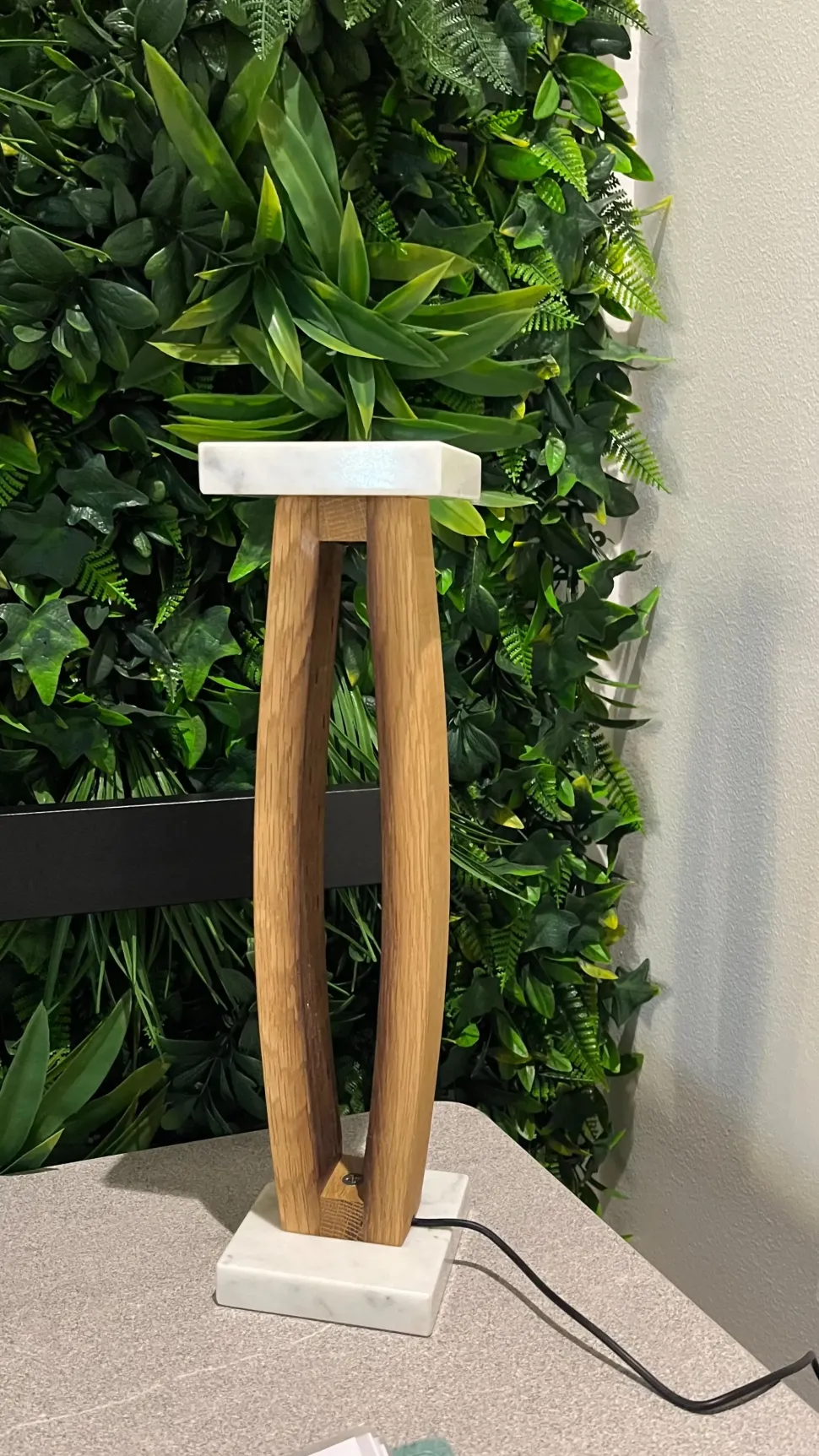 Lampada da tavolo produzione artigianale dal nome Botte piccola. I materiali usati sono il legno, il led e il marmo. Dimensione l 10 p 10 h 38 cm.