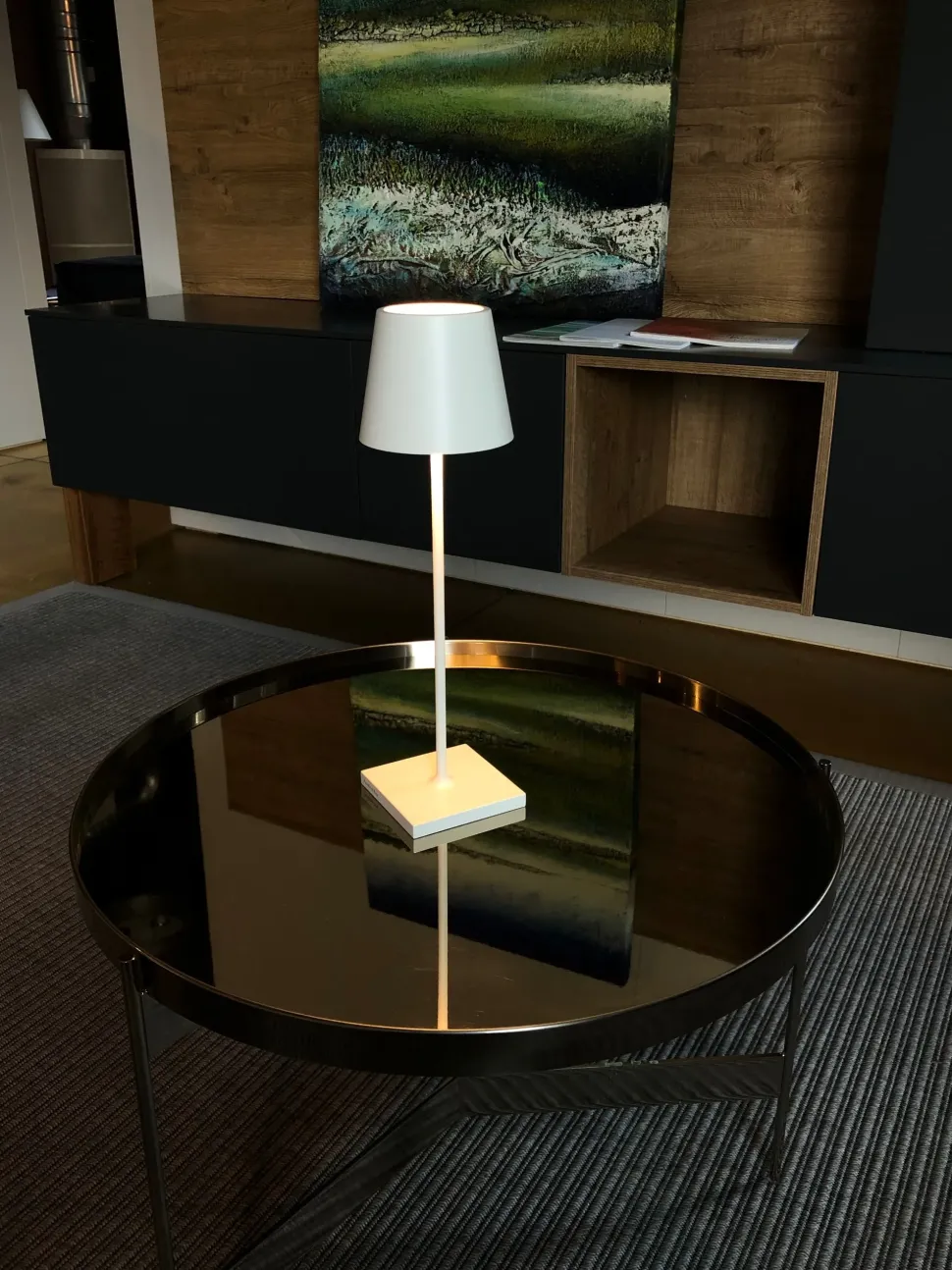 Lampada ricaricabile da tavolo, compresa di base di ricarica a contatto, con corpo in alluminio verniciato, diffusore in policarbonato e fonte luminosa a LED.