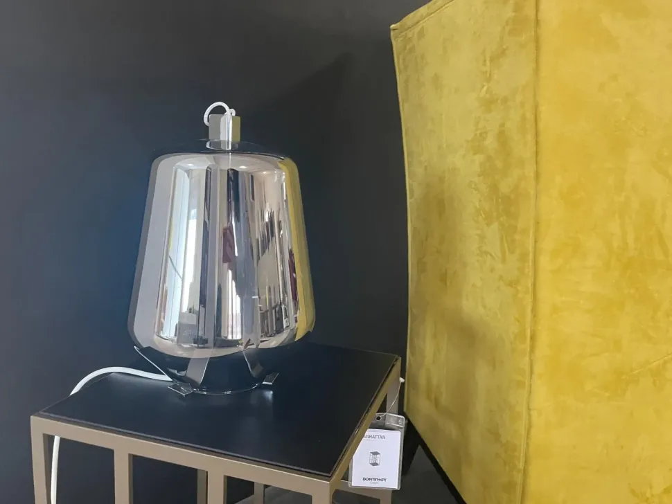 Lampada da tavolo con struttura metallica in metallo cromato, diffusore in vetro fumè. Sorgente luminosa a LED dimmerabile, temperatura di colore 2700K.