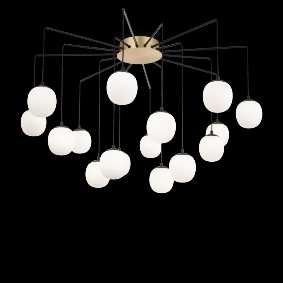 Montatura in metallo con rosone rifinito ottone satinato e bracci nero opaco. Cavi in pvc. Diffusori in vetro soffiato bianco acidato.