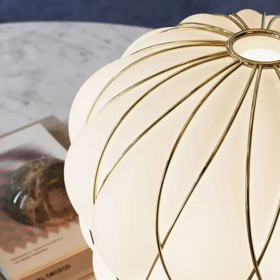 Lampada da tavolo a luce diffusa dimmerabile. Diffusore in vetro soffiato acidato ingabbiato. Gabbia e base in metallo galvanizzato. Cavo di alimentazione, dimmer e spina trasparenti. Spina europea due poli. Fonte luminosa non inclusa.