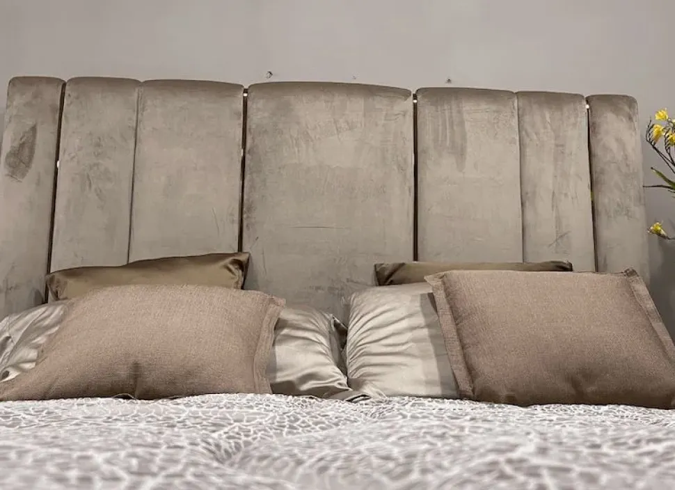 Il letto imbottito è perfetto se vuoi arredare la tua camera con uno stile romantico e contemporaneo. Il letto è rivestito in tessuto dubai 3913. I dettagli sono invece in metallo, dal colore oro rosa lucido.