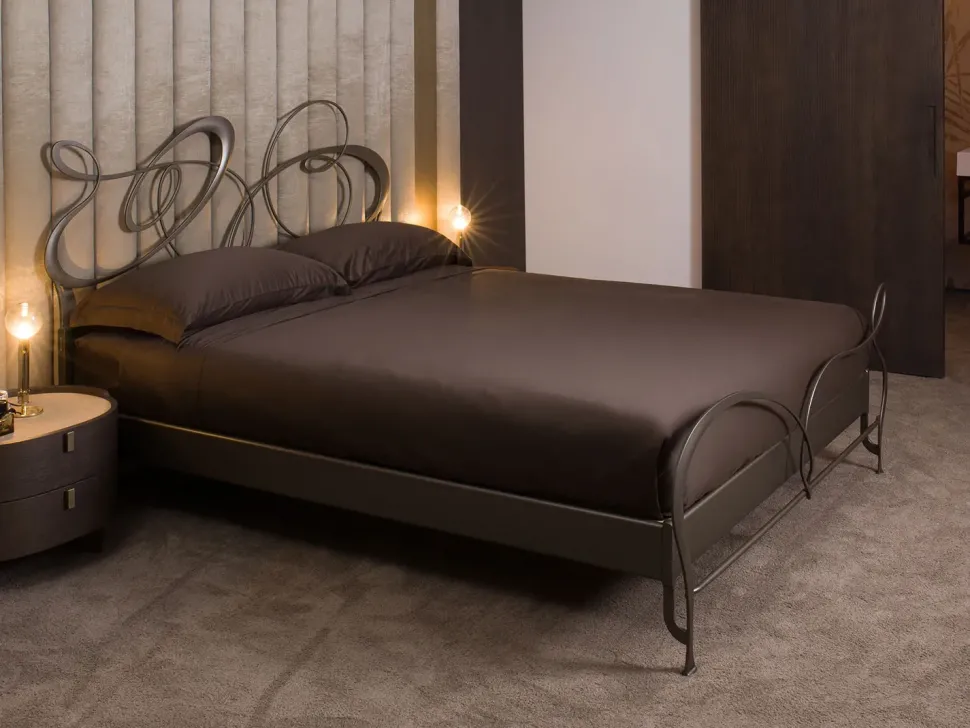 Il letto matrimoniale Ghirigori Outlet di Cantori è realizzato in ferro battuto e viene fornito completo di pediera. La struttura è interamente in ferro battuto metallizzato, tagliato a laser, levigato, lucidato e rifinito a mano. Le linee morbide e avvolgenti della testiera e della pediera si sviluppano con armonia lungo tutta la larghezza del letto, creando un design elegante e raffinato. Grazie alle lavorazioni di alta qualità eseguite da abili artigiani, Ghirigori Outlet valorizza l elemento storico di Cantori, il ferro battuto, dando vita a un letto senza tempo che si adatta perfettamente sia a camere classiche che a ambienti dal gusto più contemporaneo.