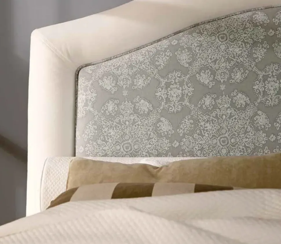 La testata curva con cornice in tessuto imbottita caratterizzata da un disegno nella parte centrale (motivo damascato).
