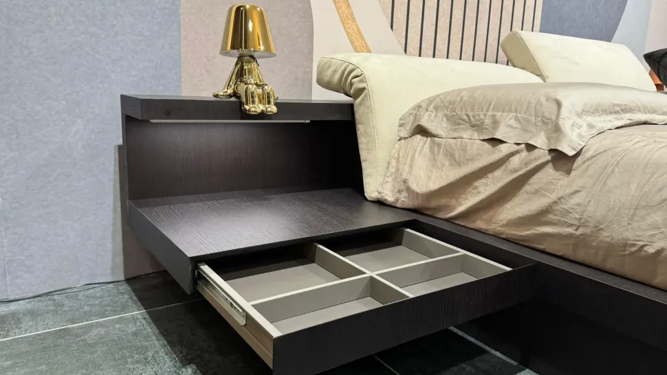 I cuscini della testiera sono reclinabili: in posizione eretta consentono una seduta piu comoda per chi ama leggere o guardare la tv a letto, mentre quando sono inclinati rendono la composizione visivamente piu armoniosa.