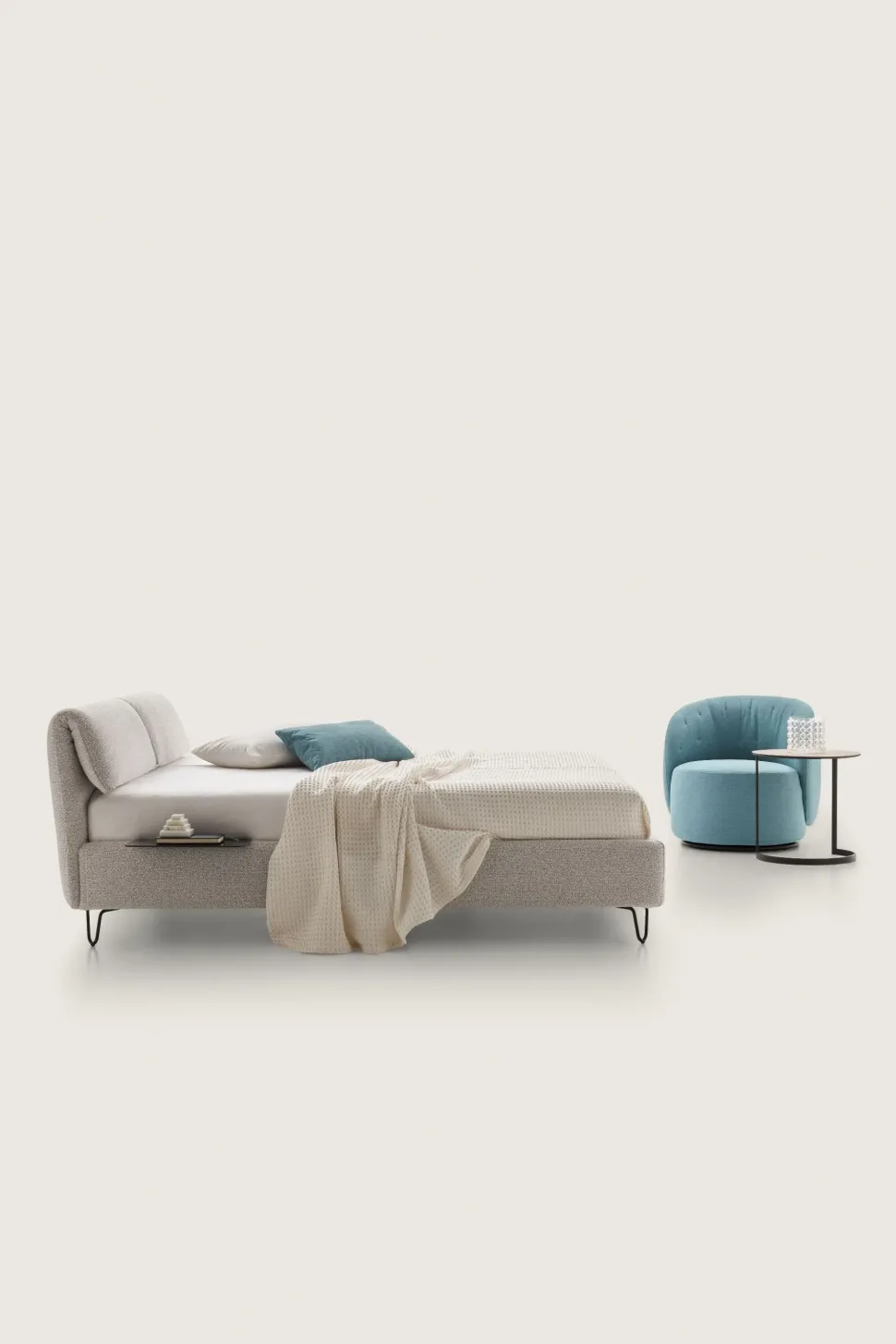 Il modello KLIZIA in foto è prodotto con giroletto e Fly H.24, con reti larghe a partire da: 160 – King size 180 o 200, tutti disponibili senza rete, con rete o con box contenitore.