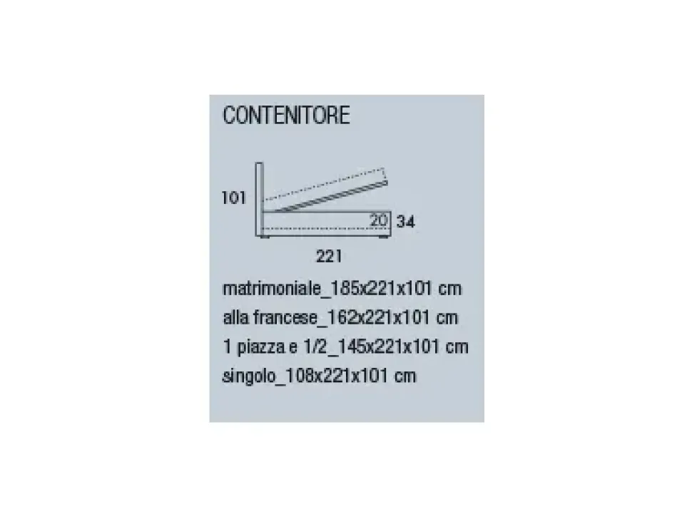Disponibile nelle dimensioni matrimoniale, alla francese, una piazza e mezzo e singolo e nelle versioni fisso, contenitore a una alzata e contenitore a doppia alzata modello pratico.