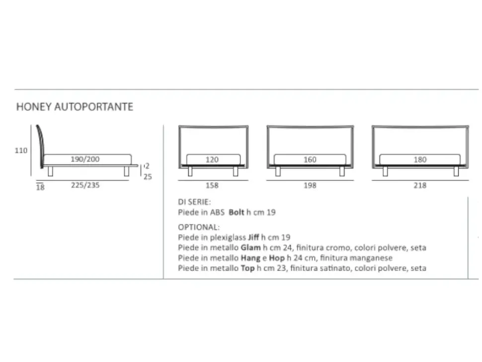 - Il prezzo esposto è relativo alla versione con rete autoportante160x200 o 190 e con rivestimenti a scelta in categoria A, piedi di serie in ABS trastarente a cilindro modello BOLT.