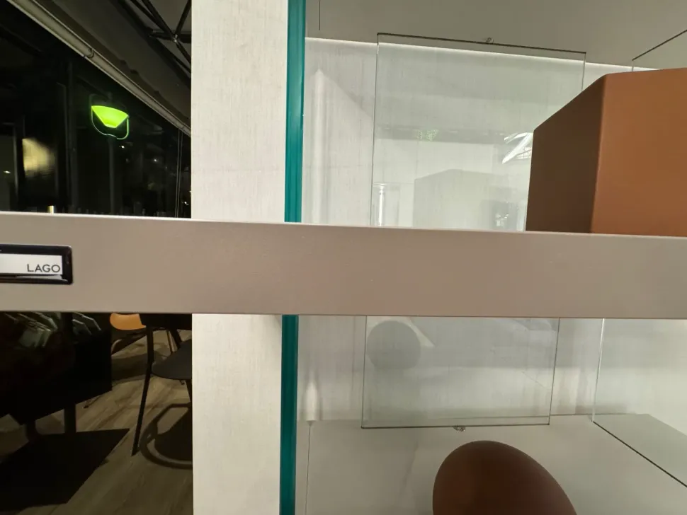 Air libreria di Lago ha spessore dei piani di 3,8 cm, garantendo stabilità e robustezza . Air libreria conta 5 ripiani in pannello di particelle di legno nobilitato melaminico, con finitura mensole Pomice e Mandorla. I fianchi e la schiena sono realizzati in vetro temperato con mezzaluna in acciaio unita tramite incollaggio UV per il fissaggio alla struttura ed hanno uno spessore di 0,8 cm.