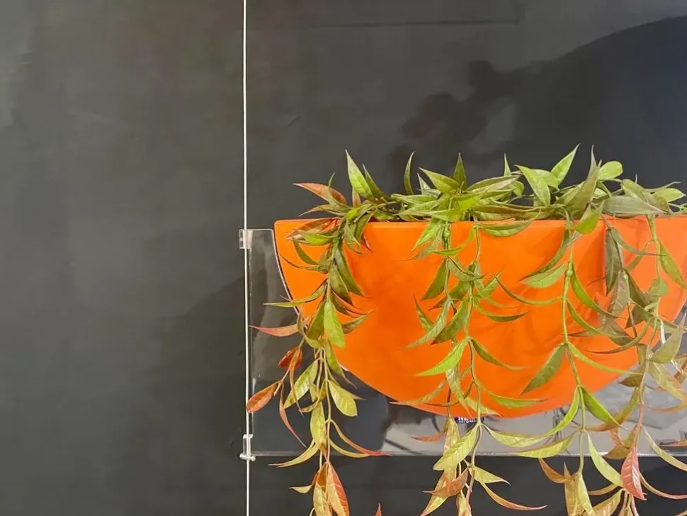 Fioriera con vasi in policarbonato colore arancione e sottostrutture in plexiglass trasparenti. Cavi di acciaio per il fissaggio a soffitto.