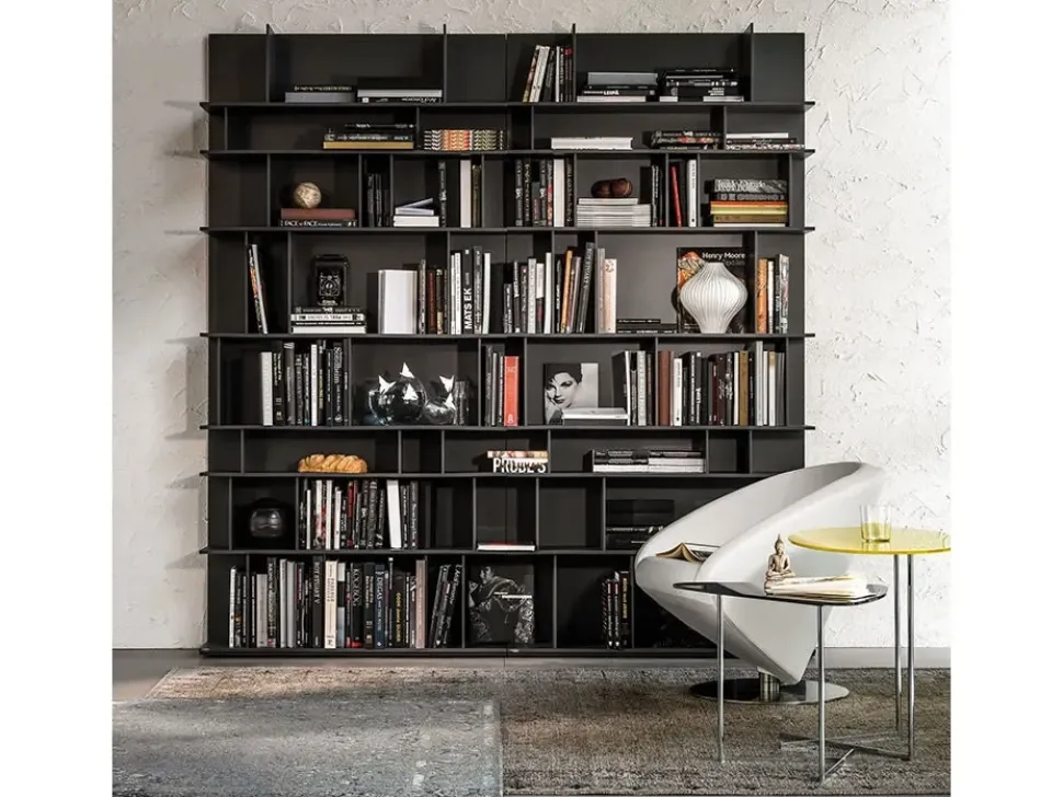 Libreria componibile in MDF laccato titanio, bronzo, bianco, nero, graphite, oyster o ottanio goffrato fine.