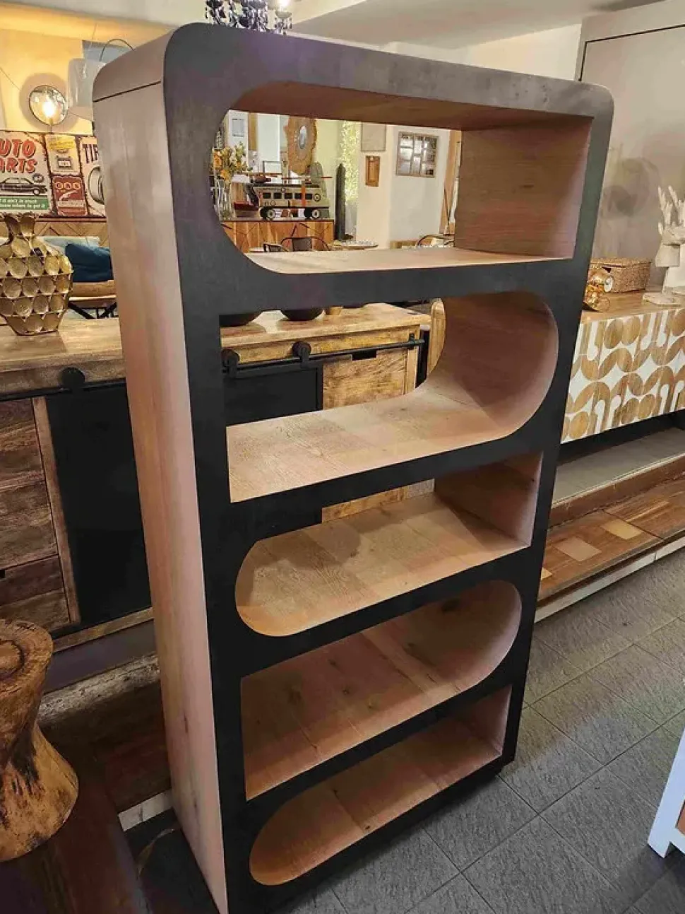 Originalissima libreria dal design etnico, con linee curve e arrotondate. Questo mobile si adatta bene ad ambienti etnici, industrial ma può essere utilizzato anche in contesti moderni, per creare contrasto o aggiungere un tocco di calore naturale.