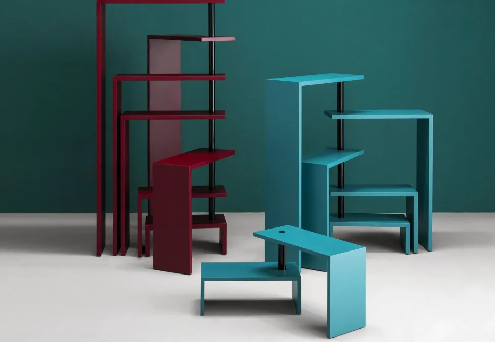 Mobile con ripiani rotanti. Piani in fibra di legno a media densità con elemento angolare interno di rinforzo in acciaio, verniciatura goffrata antigraffio nei colori bianco, nero o bordeaux. Snodi portanti in acciaio verniciato nero nei colori nero o bordeaux o bianco nella versione bianca. Il mobile è disponibile in cinque o sette ripiani.
