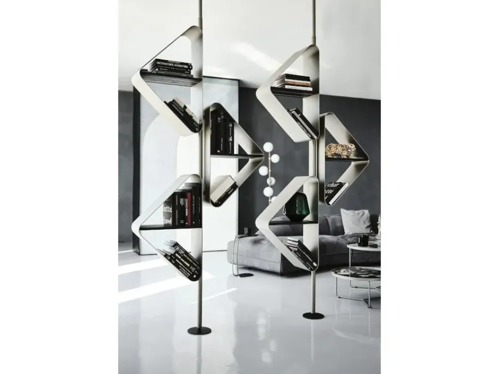 Libreria è disponibile nella versione a soffitto per dividere zone living moderne e innovative, mentre la versione a muro ottimo per arredare sala o corridoi.