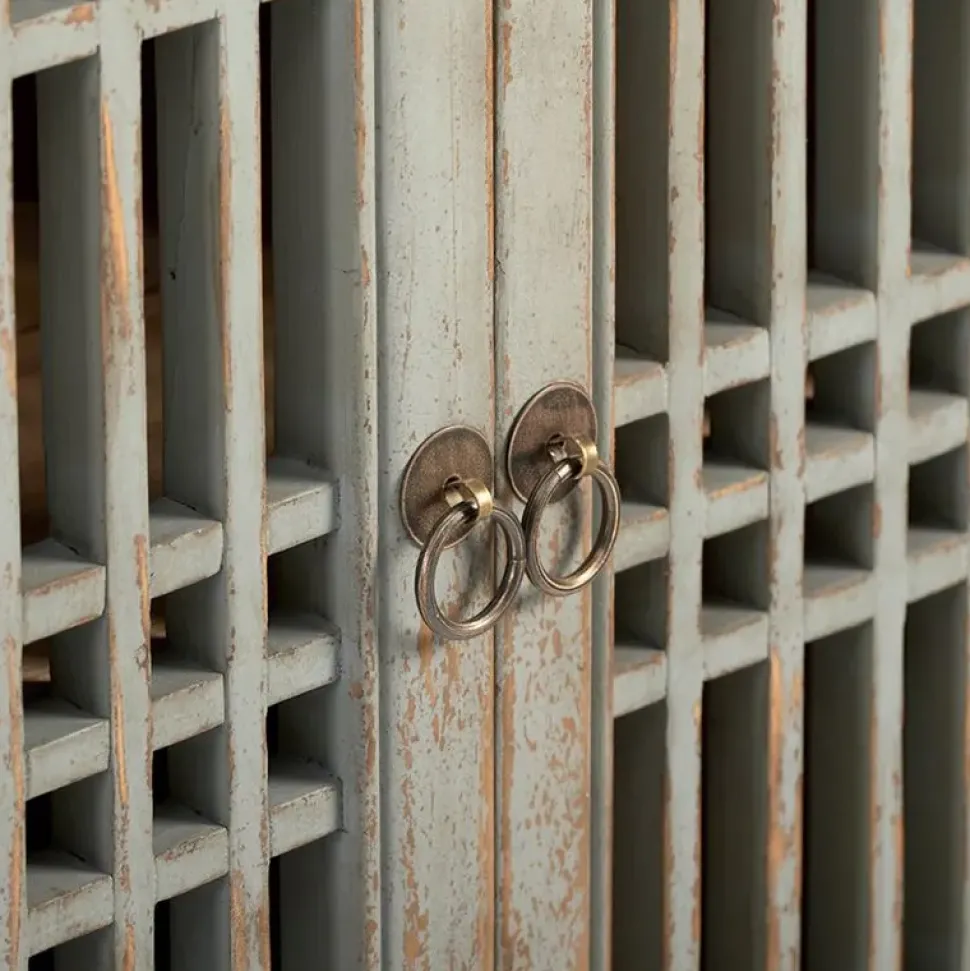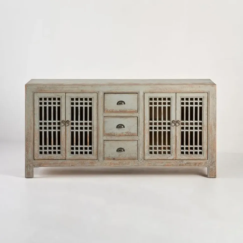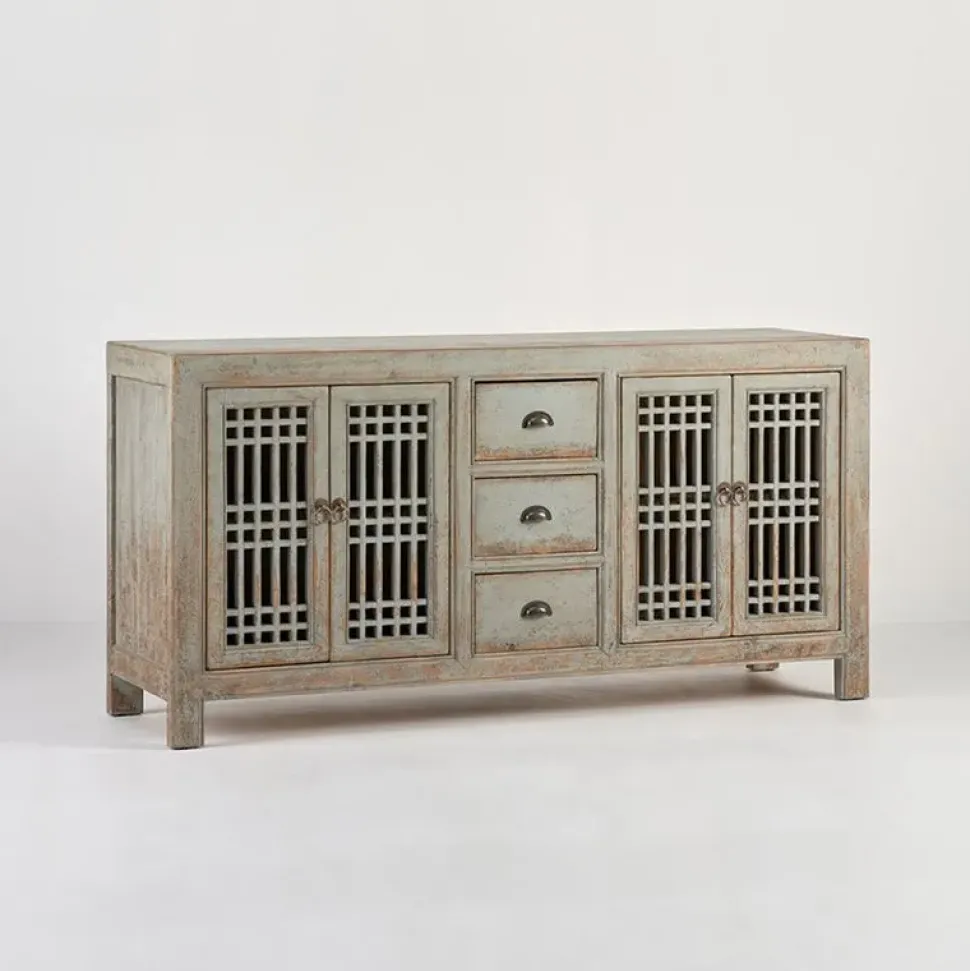 Credenza a 4 ante e 3 cassetti con maniglie e ripiani interni. Realizzata in legno massello di Old Pine finitura Brocantage. Lavorata a mano.