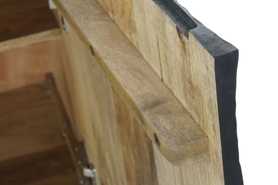 Credenza Mango Nera 160, credenza costruita artigianalmente in legno massello di mango, colore nero con inserti in metallo nel frontale delle ante in colore oro. Composta da 3 ante con mensola interna.