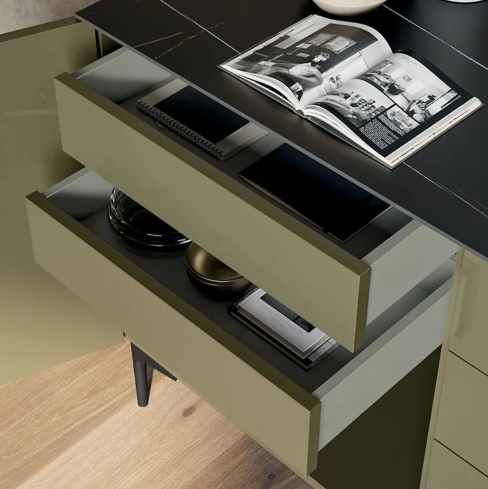 Slim viene realizzata appositamente per te. Non è un mobile standardizzato: puoi scegliere moduli, finiture, altezze, accessori e persino allestire un bar interno.