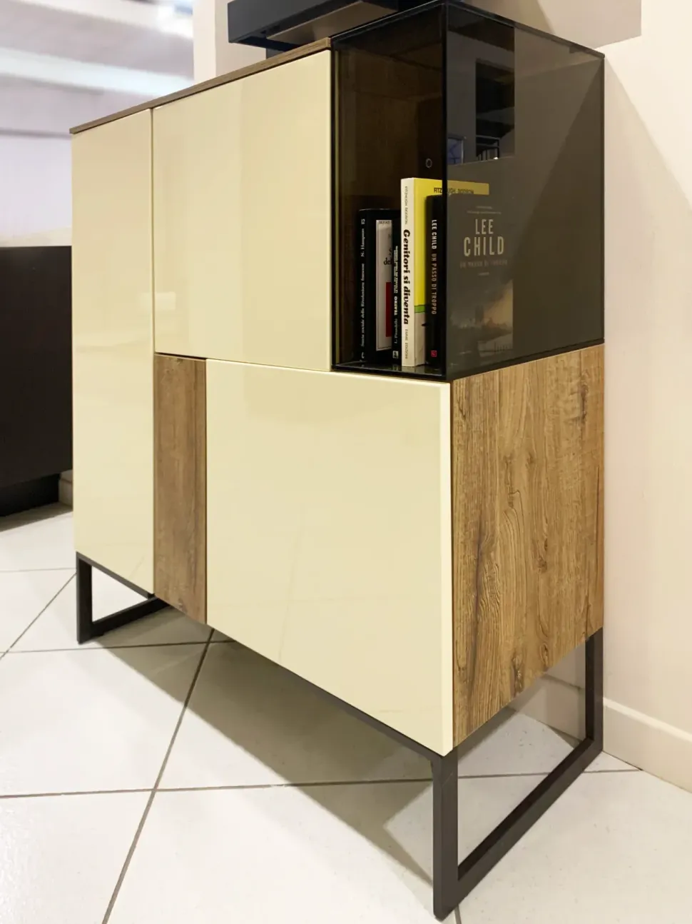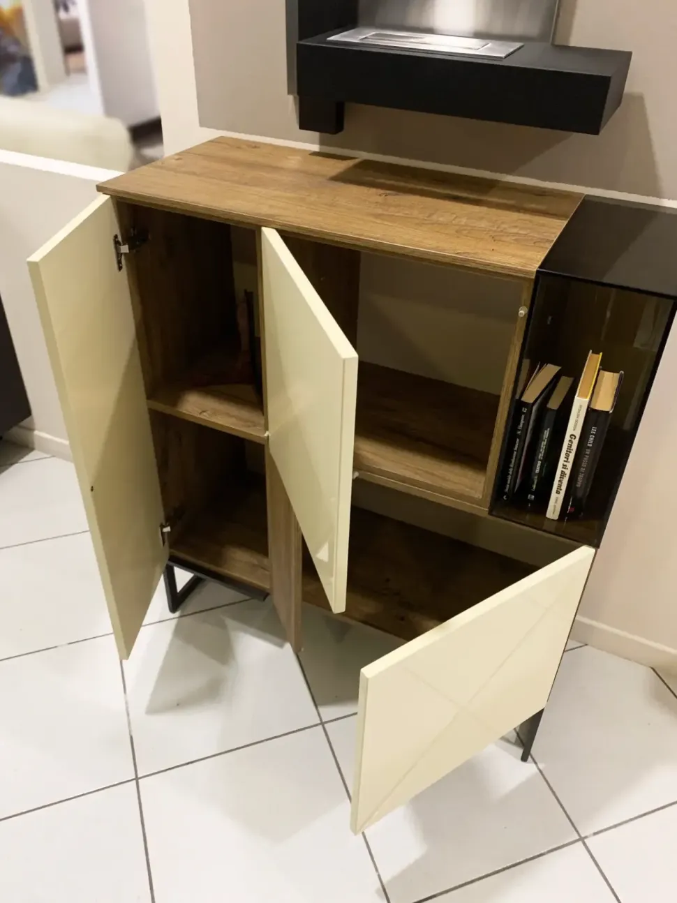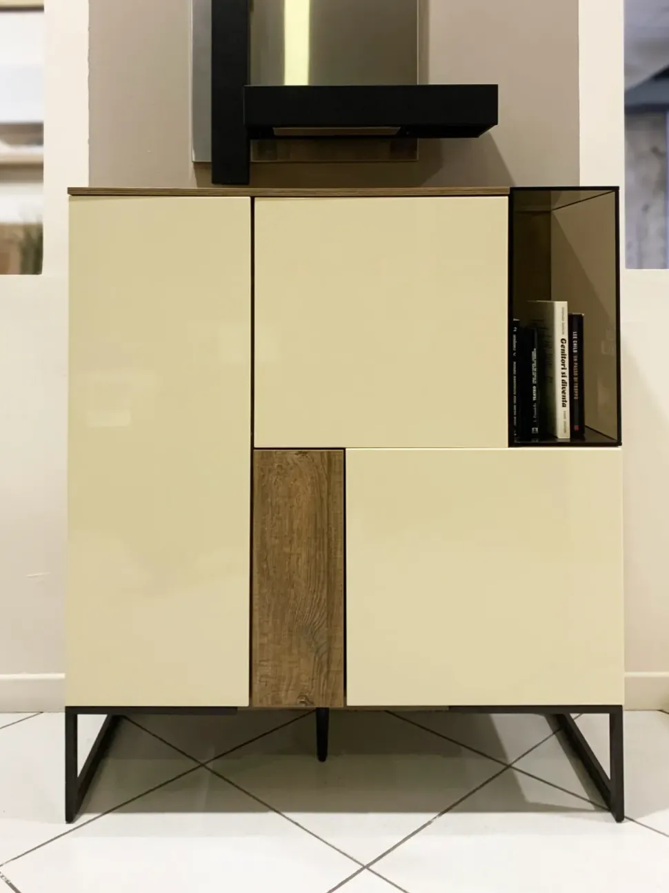 Madia in finitura avorio laccato lucido, inserti in finitura olmo con apertura push-pull.