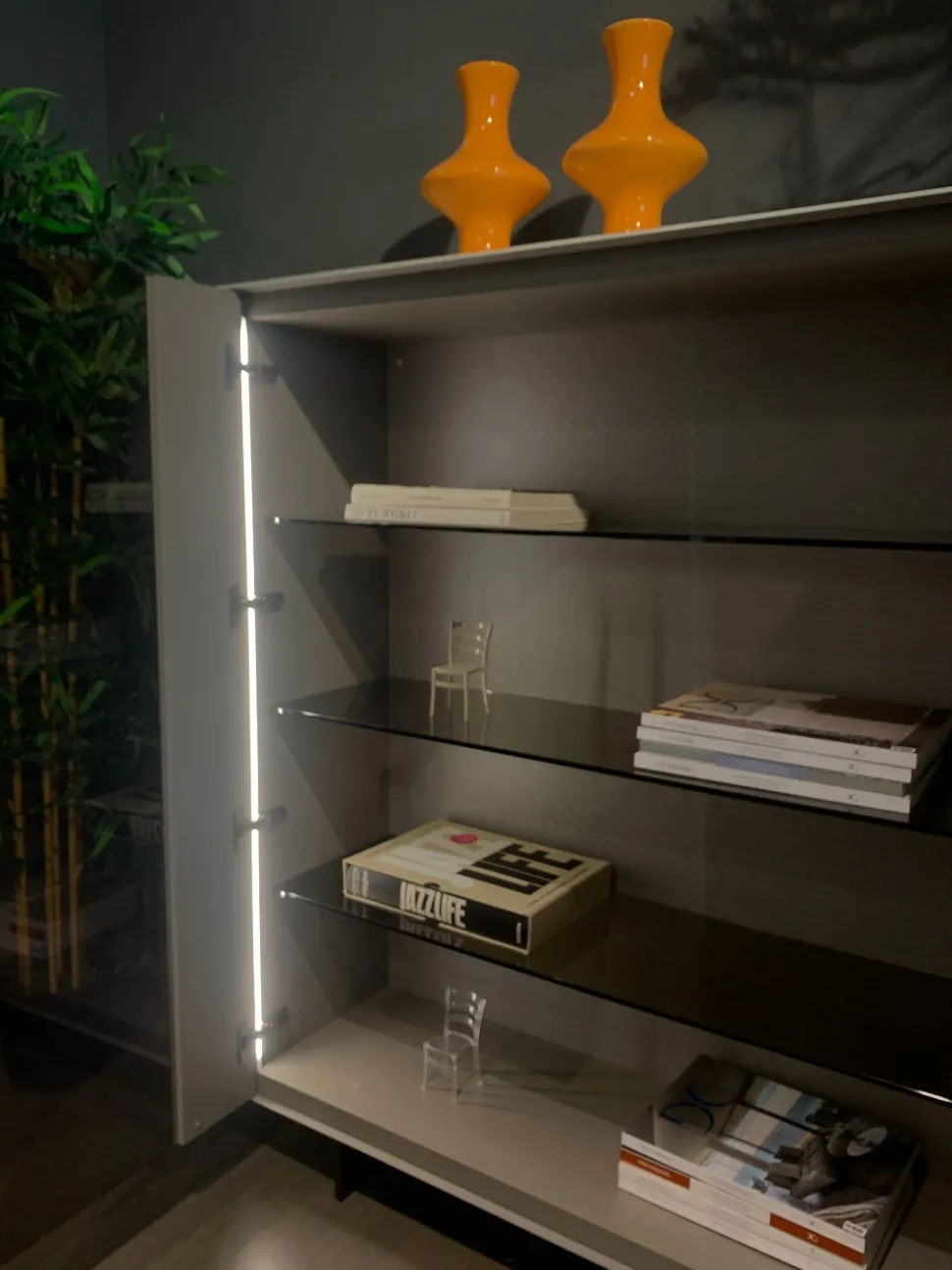 Now è un mobile contenitore con vetrine che da solo è in grado di arredare ed arricchire una parete. Le ante in vetro senza maniglie e le fasce di diversi colori sono i suoi punti di forza.
