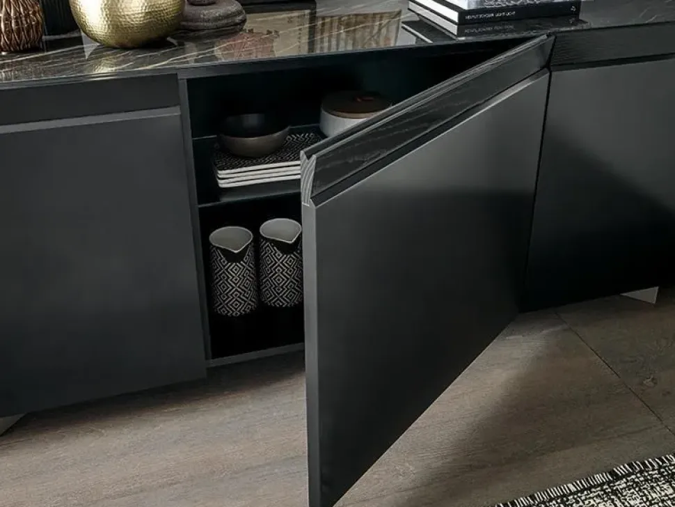 - Forme decise e materiali pregiati: scopri la madia in laccato opaco qui presente e potrai completare la zona giorno.