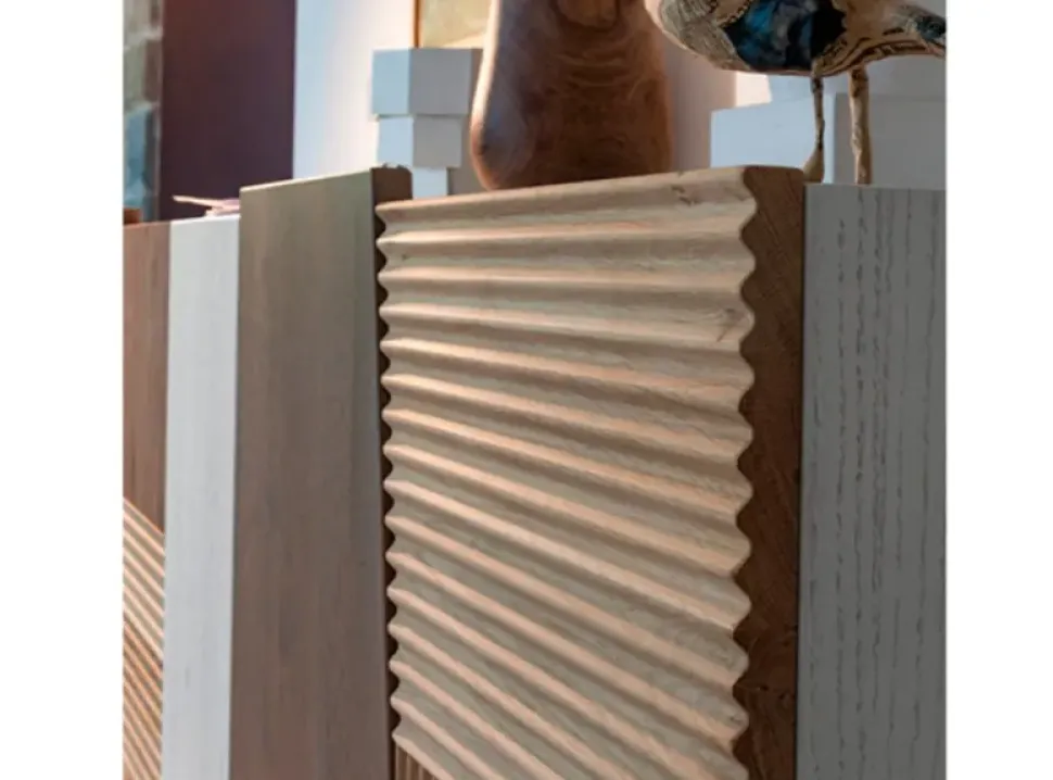 L alternanza di ante e cassetti è messa in risalto dalla lavorazione a righe concave, realizzata su legno massello, e dal diverso orientamento dato alle venature.