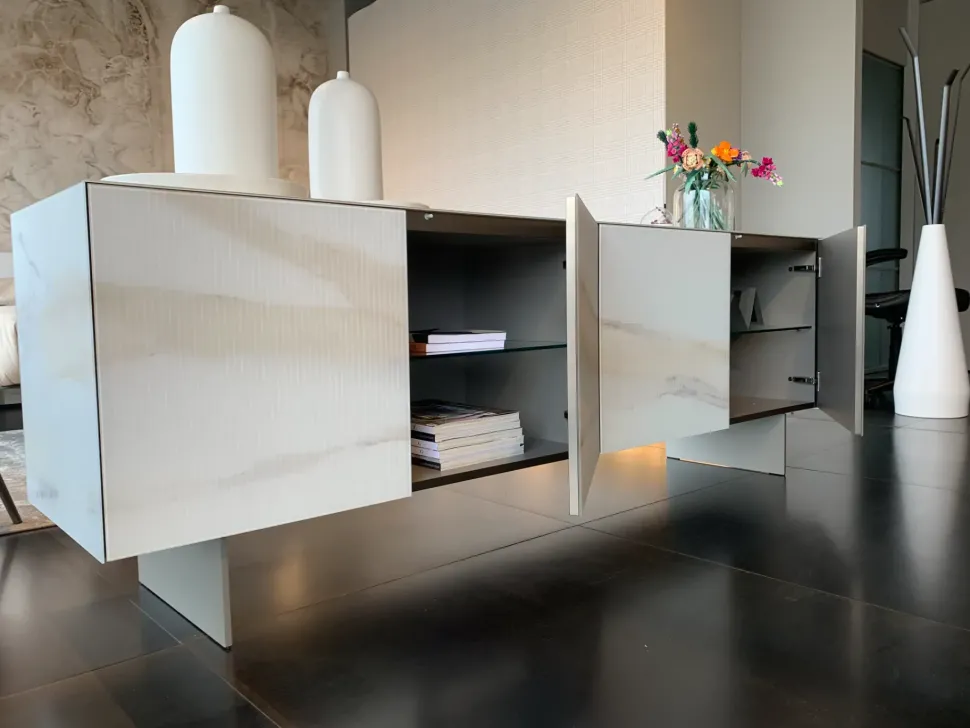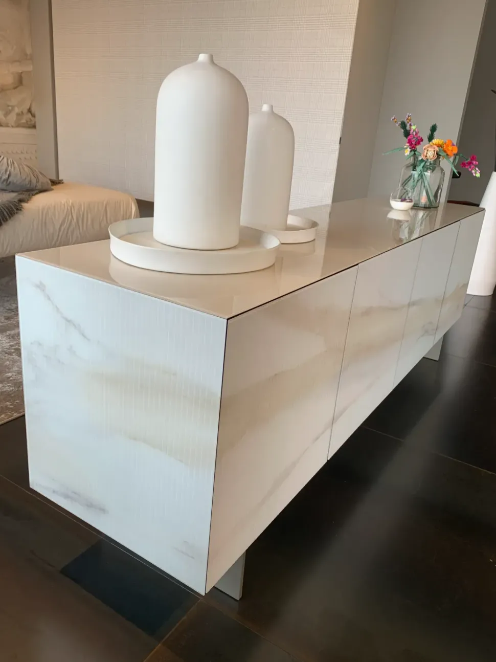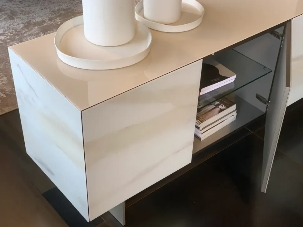 Le madie e i mobili per il soggiorno, come il modello Materia 1003 aqua presente in foto, sono essenziali sia dal punto di vista estetico che per quanto concerne la funzionalità: potrai riporci oggetti, oggetti d’uso quotidiano o prettamente decorativo. La madia in vetro in foto unisce le doti di praticità e design del locale dando vita a un progetto d’arredo moderno.
