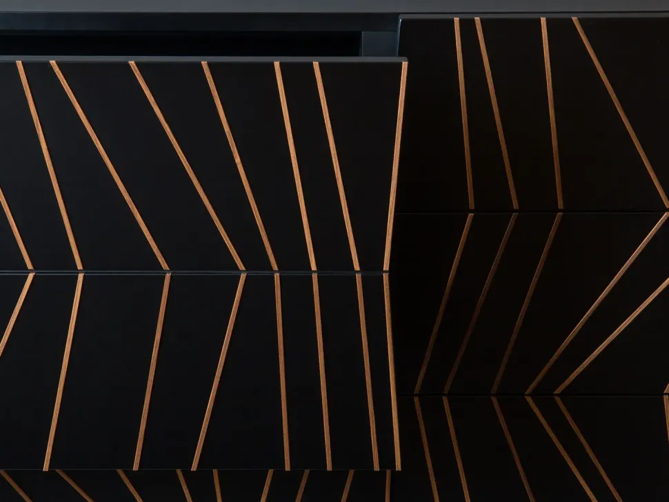 Ramses outlet è una credenza di design dal carattere distintivo, impreziosita da inserti in legno massello che creano un raffinato contrasto con la struttura e i frontali in laccato opaco nero liscio. Gli inserti, lavorati artigianalmente e posizionati a mano all’interno di fresature realizzate su ante e cassetti, presentano un motivo a zig-zag dalle inclinazioni progressive, che dona alla composizione un elegante senso di movimento.