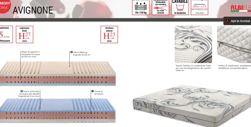 - Quando cerchi un materasso niente è imprescindibile da valutare quanto la tipologia di imbottitura: ci sono sul mercato versioni a molle, estremamente resistenti nel tempo e compatte, a molle insacchettate, che consentono di creare zone di portata differenziata, in lattice, materiale estremamente morbido e anatomico, o in Memory Foam, sostanza morbida e in grado di adattarsi alla perfezione alle forme anatomiche; è tanto importante valutare attentamente le molteplici tipologie per capire se questo materasso Avignone, che è memory, fa al caso tuo.