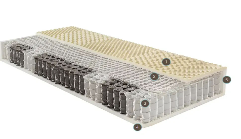 Misura: 160×200 – Sfoderabile e lavabile a 60°C – 3200 molle indipendenti – 7 zone differenziate – portanza sostenuta – Altezza materasso H.25cm – Piano superiore in memory bugnato sp.3cm.